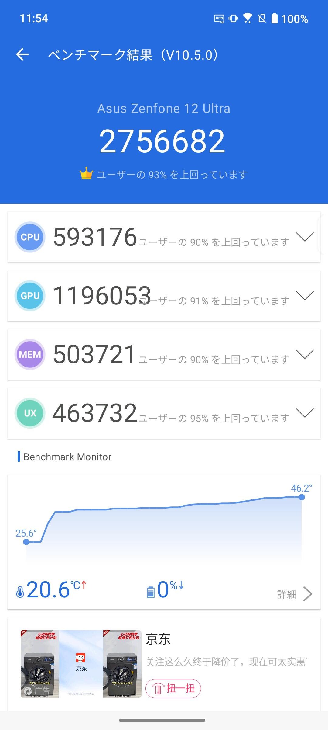 ベンチマークアプリ「AnTuTu Benchmark」の結果。左がハイパフォーマンスモードこと、システムモードの「高性能」でスコアは275万6682、右が一般的な使い方で使用する際におススメなモードの「ダイナミック」でスコアが231万5854に。各項目を比べると、高性能では主にGPUが劇的に向上する模様