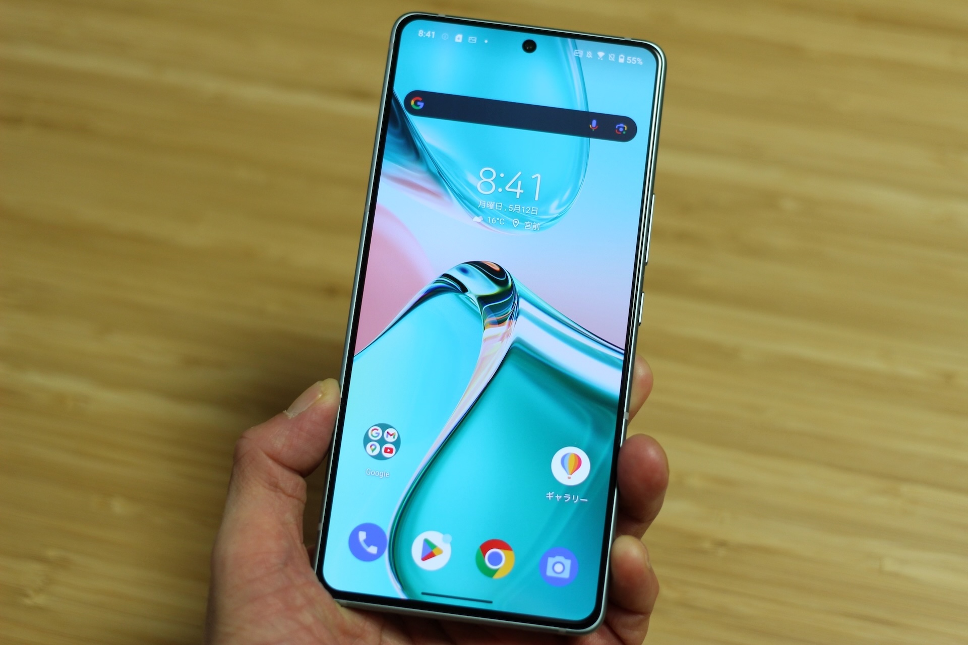 画面は上部中央にパンチホールが配置されたアスペクト比9:20の縦長な約6.78インチFHD+(1080×2400ドット)LTPO Flexible AMOLED(有機EL)ディスプレイを搭載し、パネルはSamsung Display製「E6」を採用しており、可変リフレッシュレート1〜120Hz(ゲーミング時のみ最大144Hz)や明るさ最大2500nits、DCI-P3 107.37%、sRGB 145.65%、NTSC 103.16%、ΔE<1、HDR10+、Amazon HDR、Youtube HDRをサポートしており、パンチホール部分には倍率を1倍と0.7倍に切り替え可能な約3200万画素CMOS(1/3.2型、1画素0.7μm、RGBW、4in1)+広角レンズ(F2.5、画角90°、焦点距離22mm相当)のフロントカメラが内蔵されています。