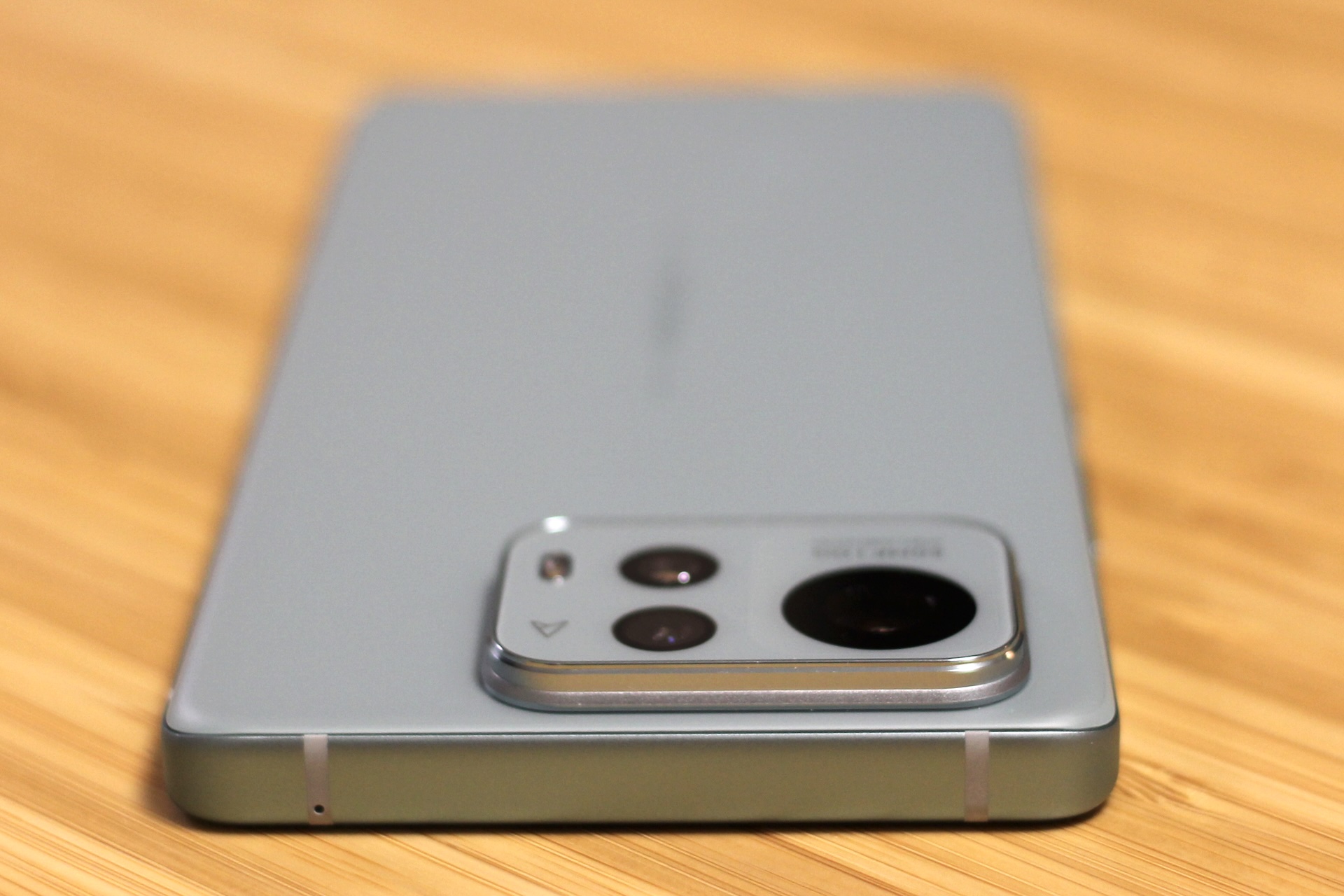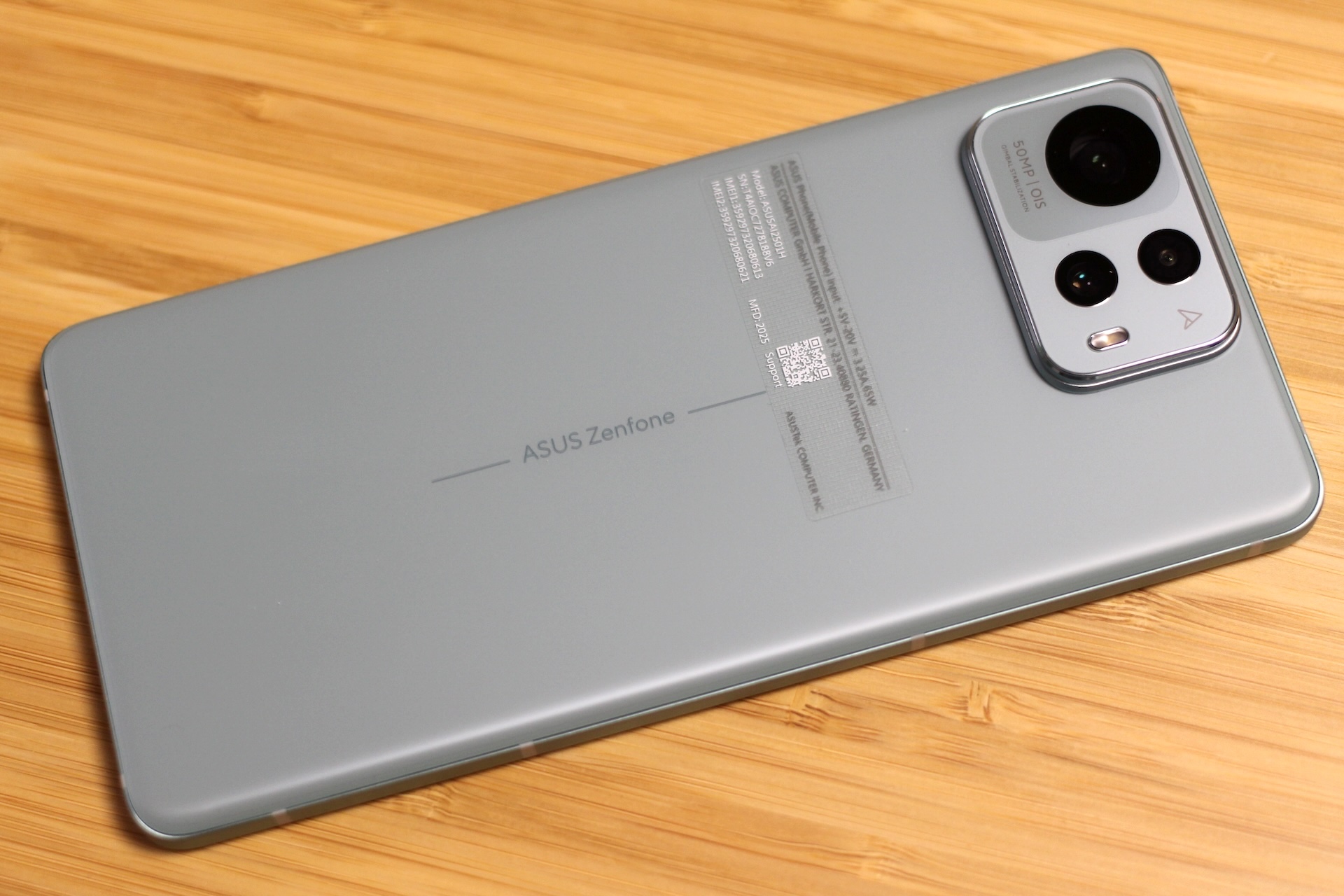 Zenfone 12 Ultraのセージグリーンの背面。最近のZenfoneにはありがちな薄めの渋めな色合いで、少しグレーがかったスモーキーな緑色といった印象。なお、IMEIなどが記載されたシールは簡単に剥がせます