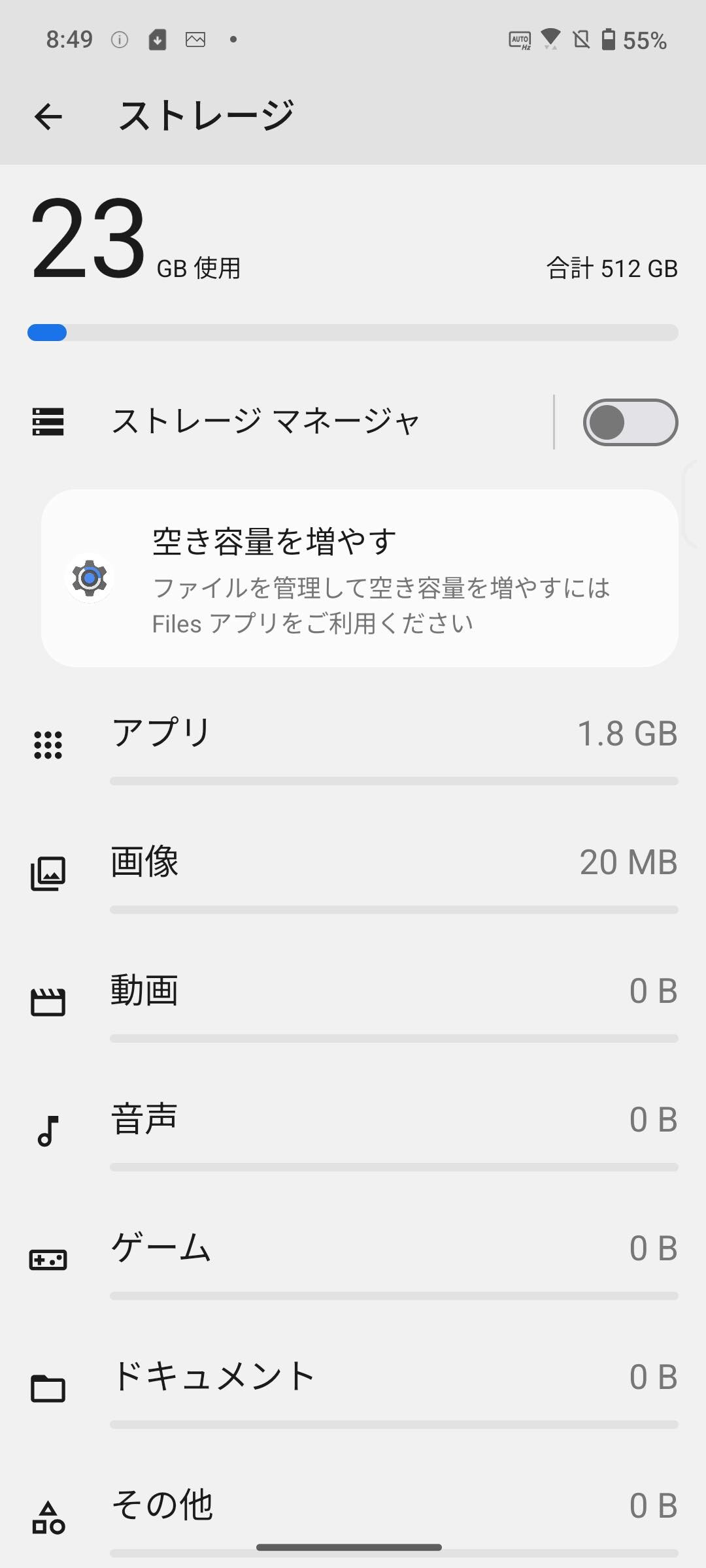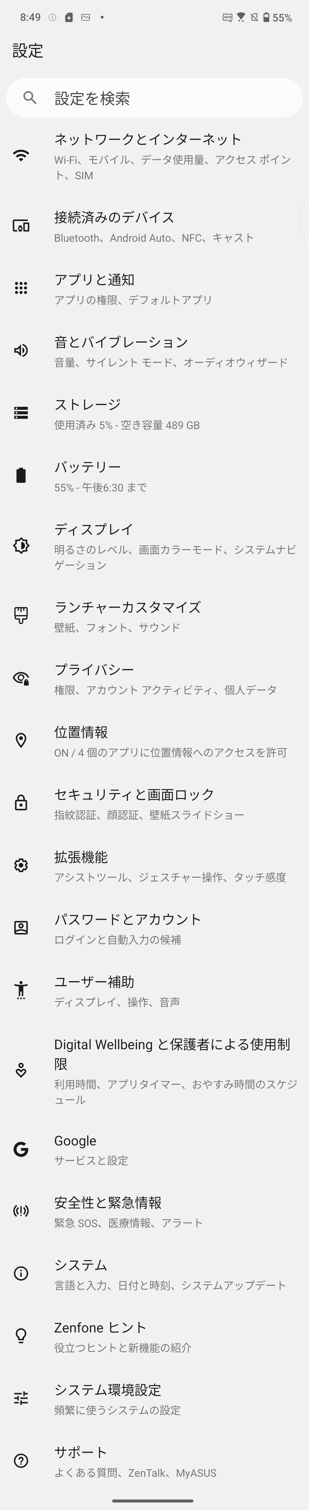設定の「ストレージ」と「システム」→「認証」の画面。初期設定直後では23GBほど使っており、残りは489GBほどとなっており、microSDカードなどの外部ストレージスロットはないのでうまくクラウドストレージなどを利用したいところ。なお、日本向けの認証は電波法に基づく工事設計認証(R)が「020-240371」、電気通信事業法に基づく技術基準適合認定(T)が「ADF240109020」