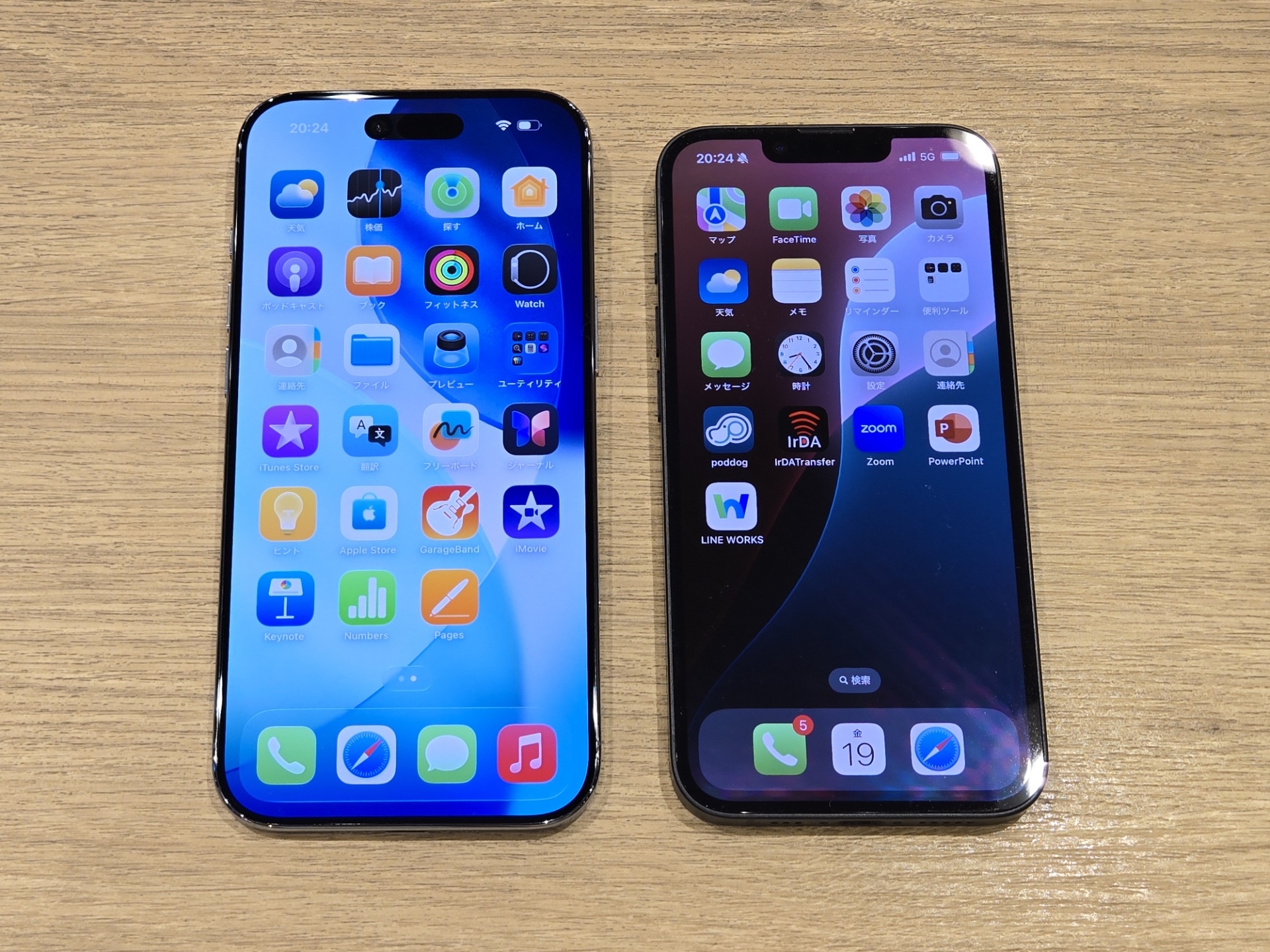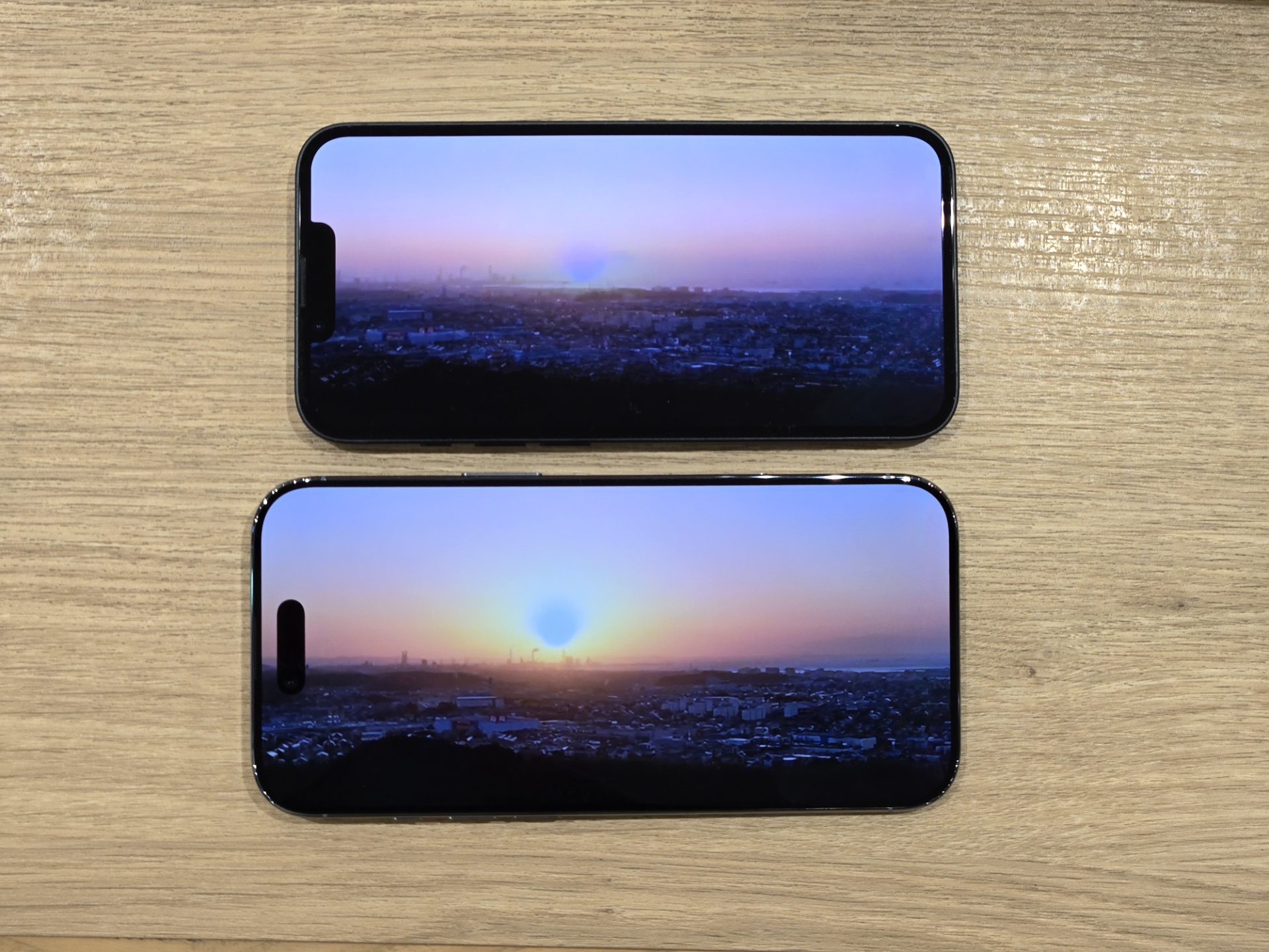 画面は上部中央に幅の広いパンチホールのある約6.5インチ1260×2736ドットSuper Retina XDR OLEDディスプレイを搭載しており、ピーク輝度が3000nits、ダイナミックリフレッシュレートが最大120Hzで、フロントガラスは強化ガラス「Ceramic Shield 2」で保護されています。またパンチホール部分には約1800万画素CMOS/広角レンズのフロントカメラがあり、センターフレーム機能やデュアルキャプチャ機能によって撮影者の向きに応じて横向き・縦向きに対応しています。
