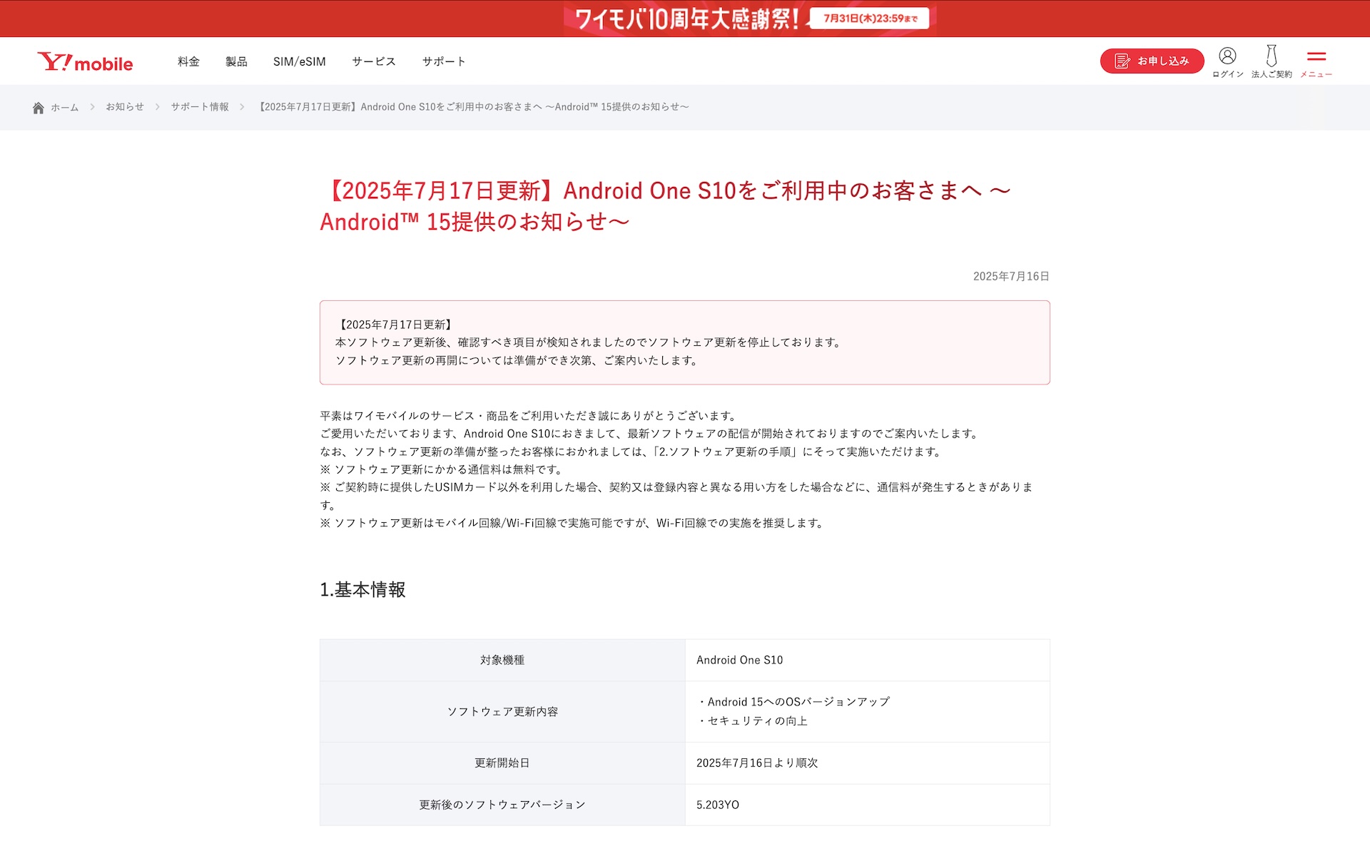 ・【2025年7月17日更新】Android One S10をご利用中のお客さまへ ~Android 15提供のお知らせ~ / 2025/7/16|サポート情報|お知らせ|Y!mobile - 格安SIM・スマホはワイモバイルで
