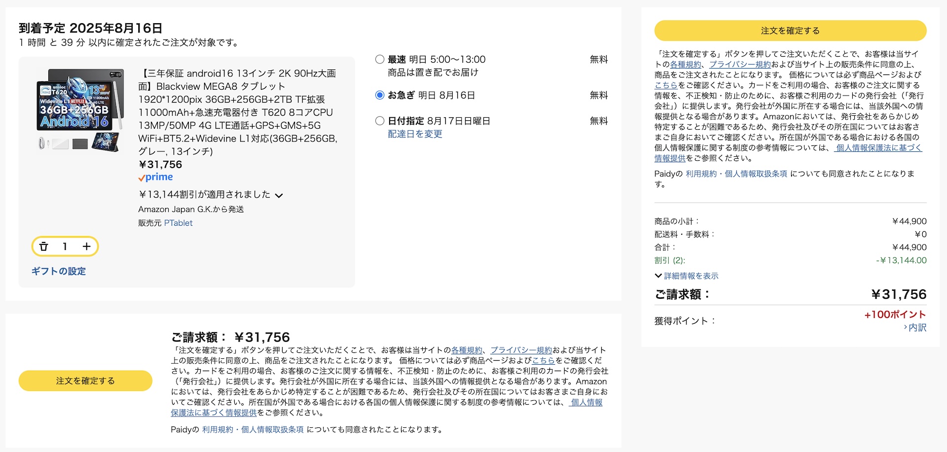 価格(金額はすべて税込)はグレーなら通常44,900円ですが、2025年8月15日(金)から8月24日(日)まで10,001円割引クーポンが配布されていて34,899円となっており、さらに注文時に7%OFFになる限定クーポン「52M67W9O」を適用すると3,143円割引となるため、合わせて29%OFFの31,756円で購入できるようになっています。なお、同社では既存のBlackview MEGA 8のAndroid 15搭載モデル( https://amazon.co.jp/dp/B0FH6QBYHL )も併売しており、現在は46,000円で販売されています。