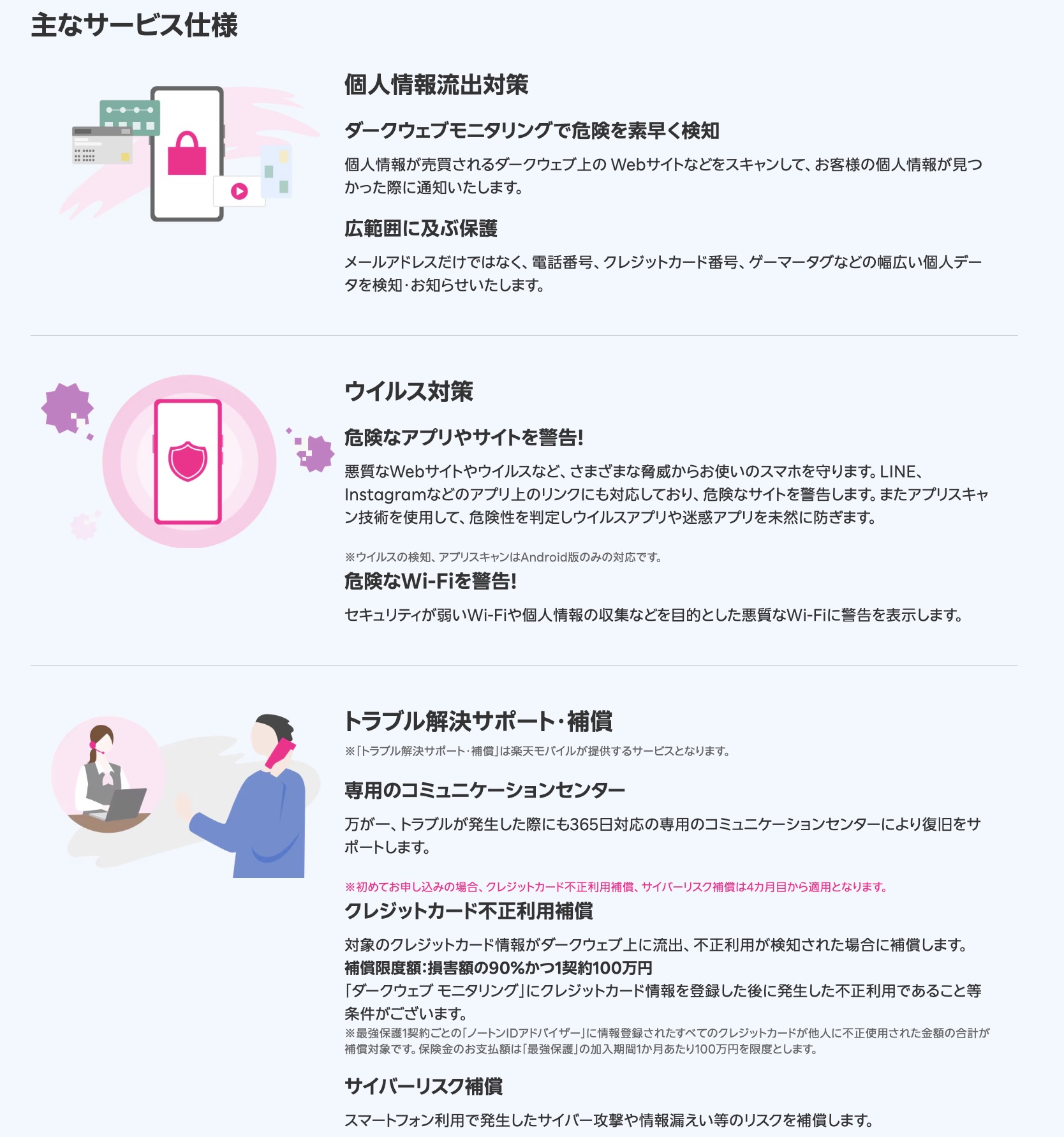 (3)トラブル解決サポート・補償:専用のコミュニケーションセンターによる365日電話サポートに加え、クレジットカード不正利用補償(最大損害額の90%かつ100万円)、サイバーリスク補償(最大150万円)など幅広い補償を提供します。