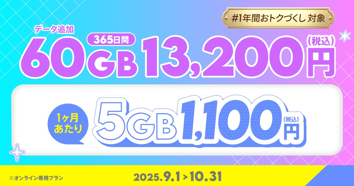 価格(金額はすべて税込)および提供時期はデータ追加1TB(365日間)が38,160円で2025年11月30日(日)23:59まで、データ追加60GB(365日間)が13,200円で2025年10月31日(金)23:59まで。これにより、データ追加1TB(365日間)は1カ月間当たり約85GBを3,180円で利用可能となるため、1年間に渡ってデータ容量を気にせずに使いたい場合にオススメとなっています。
