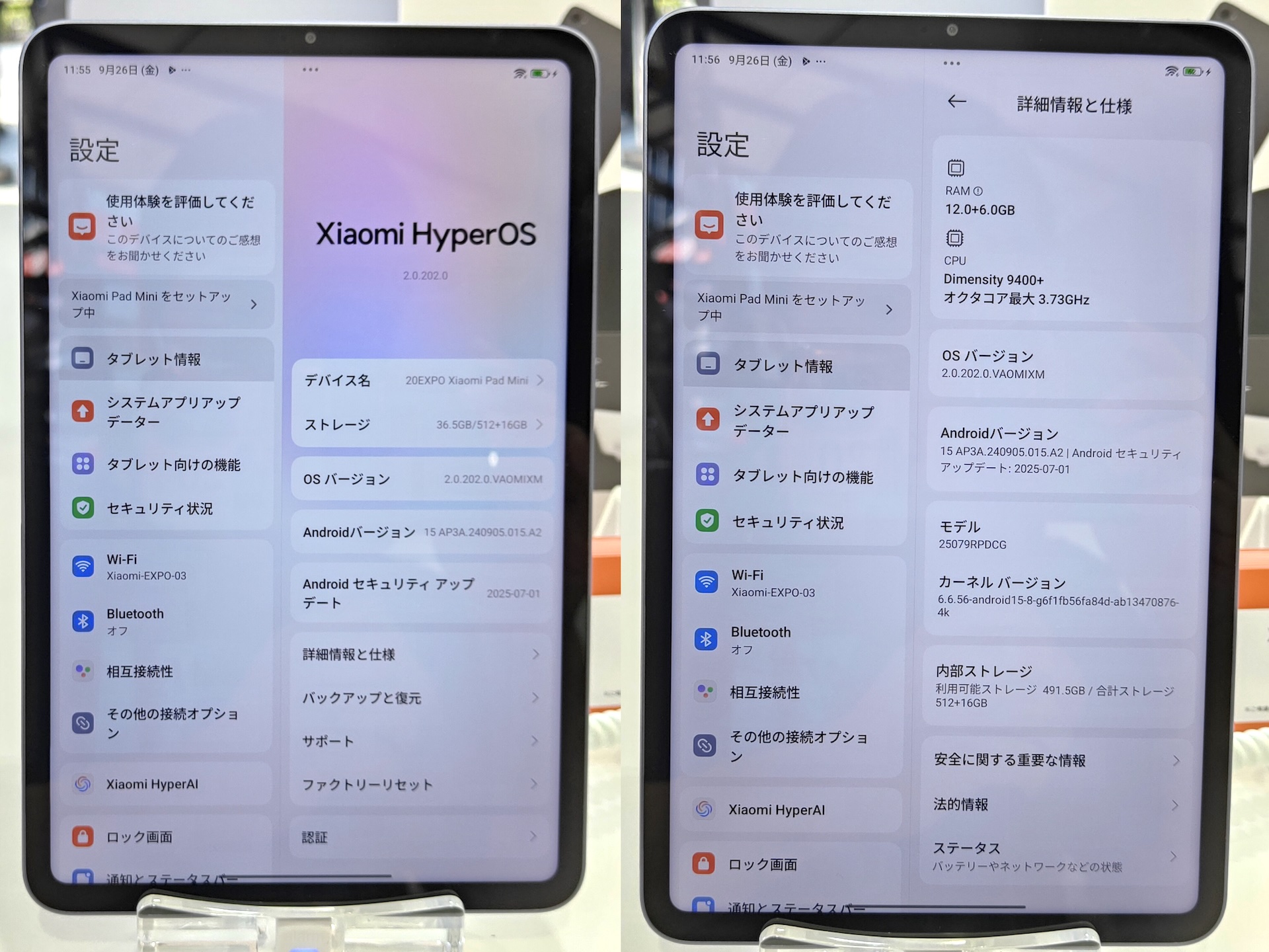 その他の仕様ではWi-Fi 7に対応したIEEE802.11a/b/g/n/ac/ax/be準拠(2.4および5、6GHz)の無線LAN、Bluetooth 5.4、加速度センサー、ジャイロセンサー、フロント環境光(色温度)センサー、ホールセンサー、磁気センサー、X近接センサー、軸リニアモーターなど。NFCや3.5mmイヤホンマイク端子、microSDカードなどの外部ストレージスロットは非搭載。同梱品はXiaomi Pad Mini本体のほか、ACアダプター(試供品)およびUSB Type-Cケーブル(試供品)、クイックスタートガイドなどの紙類となっています。