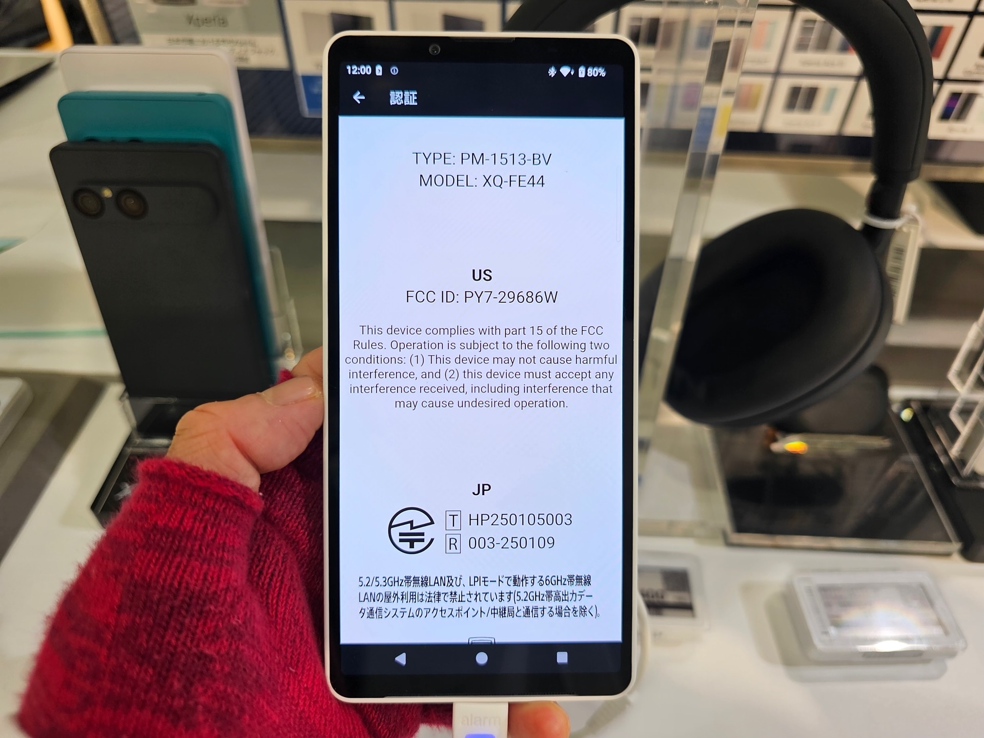 Xperia 10 VII XQ-FE44の認証情報。モデル名は「XQ-FE44」で、タイプは「PM-1513-BV」となっており、中国製であることが記載されています。なお、日本向けの認証(いわゆる「技適」)の番号は電波法に基づく工事設計認証(R)が「003-250109」、電気通信事業法に基づく技術基準適合認定(T)が「HP250105003」