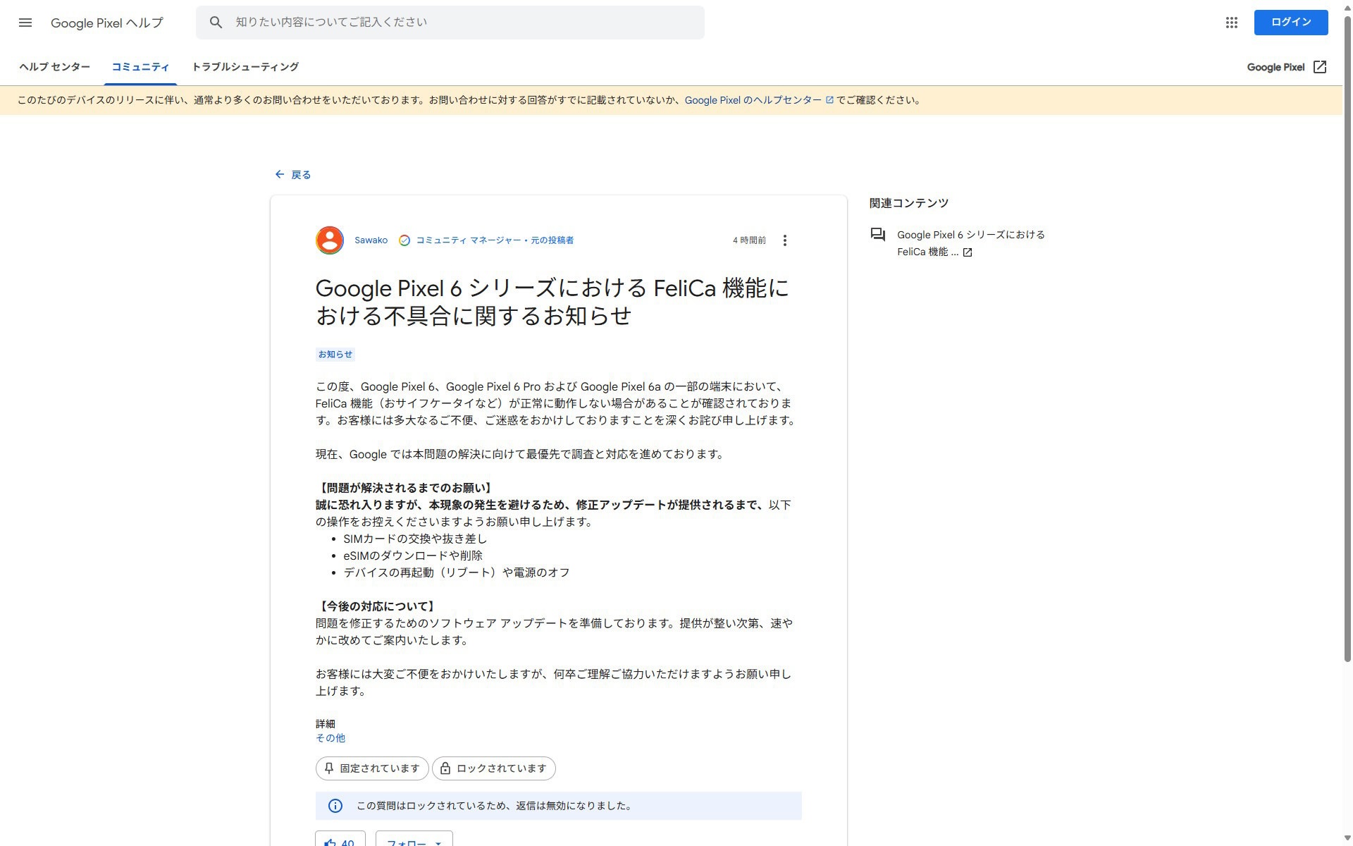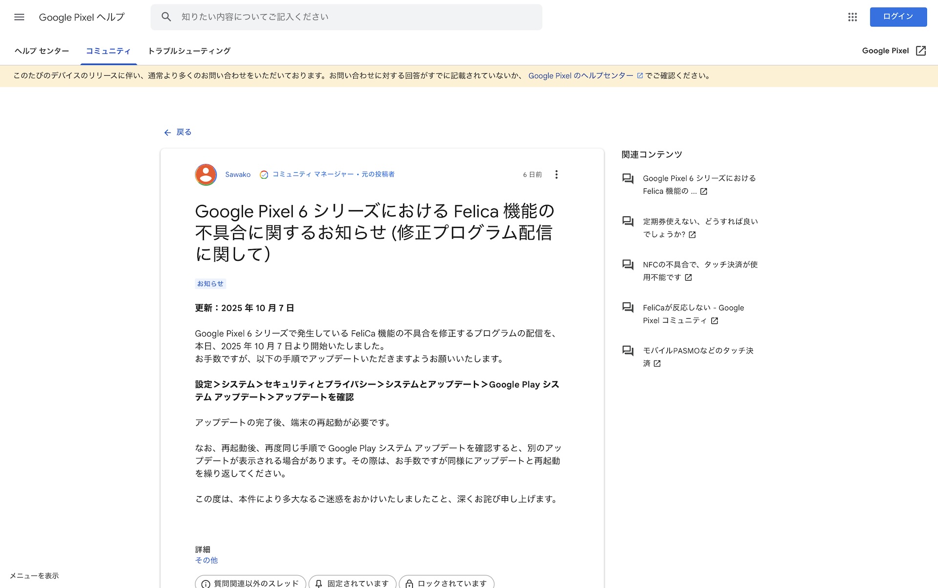 ・Google Pixel 6 シリーズにおける Felica 機能の不具合に関するお知らせ (修正プログラム配信に関して) - Google Pixel コミュニティ