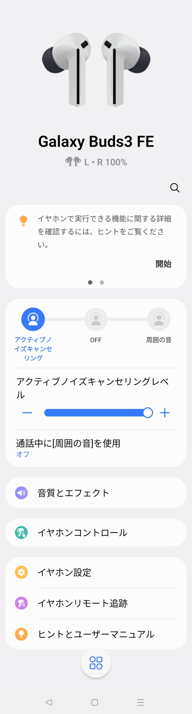 スマートフォンとSamsung Galaxy Buds3 FEをペアリングし、接続をONにした状態でGalaxy Wearableアプリを起動する。