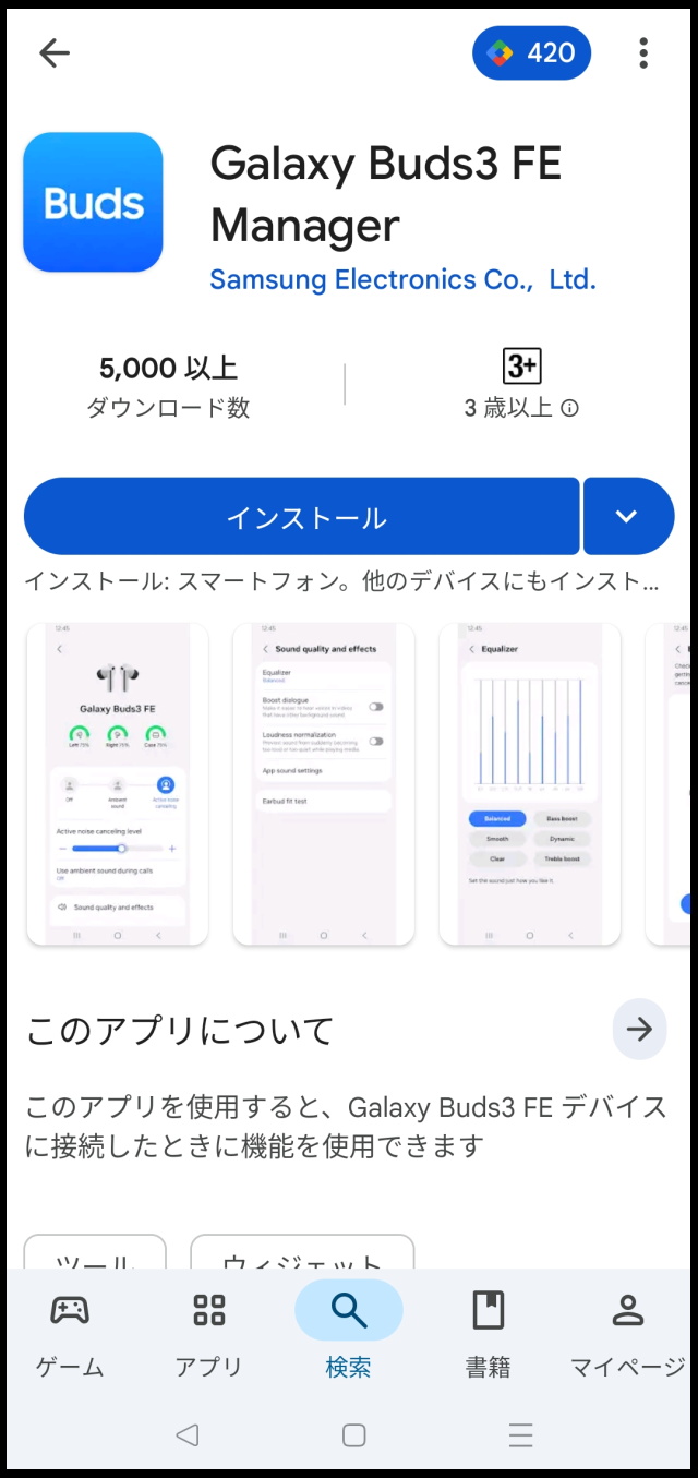 Samsung Galaxy Buds3 FEをコントロールするための専用アプリ「Galaxy Buds3 FE Manager」を利用するためには、あらかじめ「Galaxy Wearable(Gear Maneger)」アプリをインストールしておく必要がある。