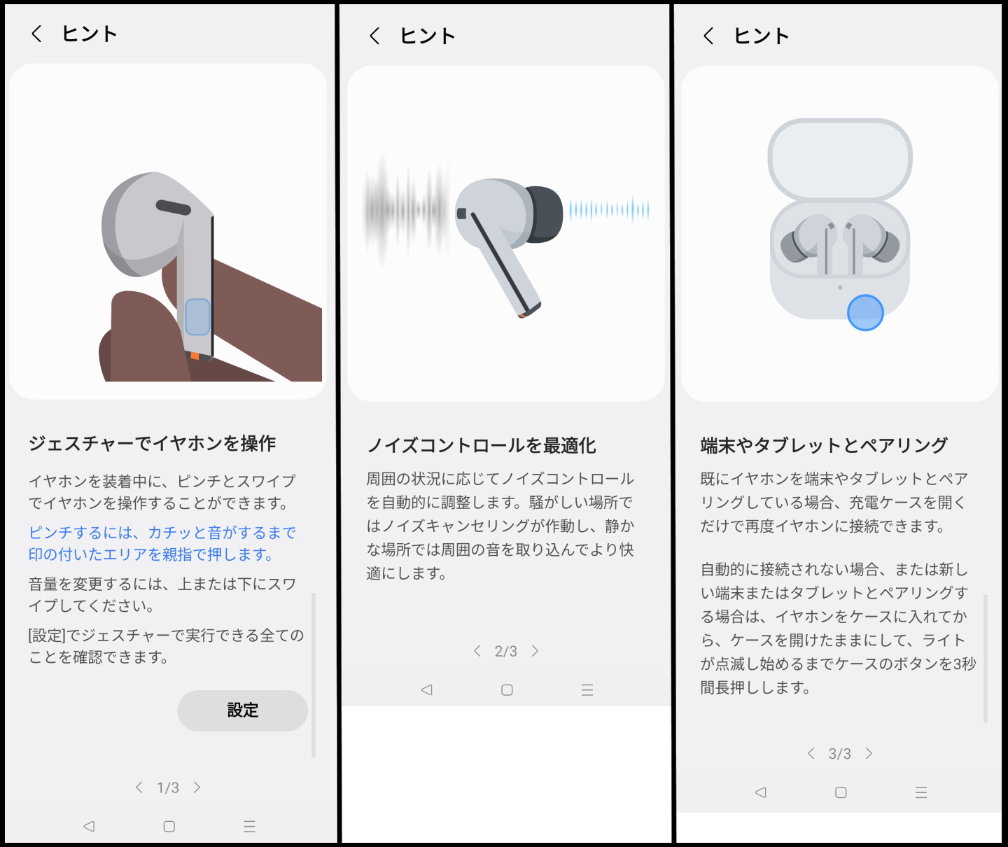 「ヒント」では、イヤホン本体での操作方法や、ノイズコントロールの最適化、ペアリングについての説明が表示される。