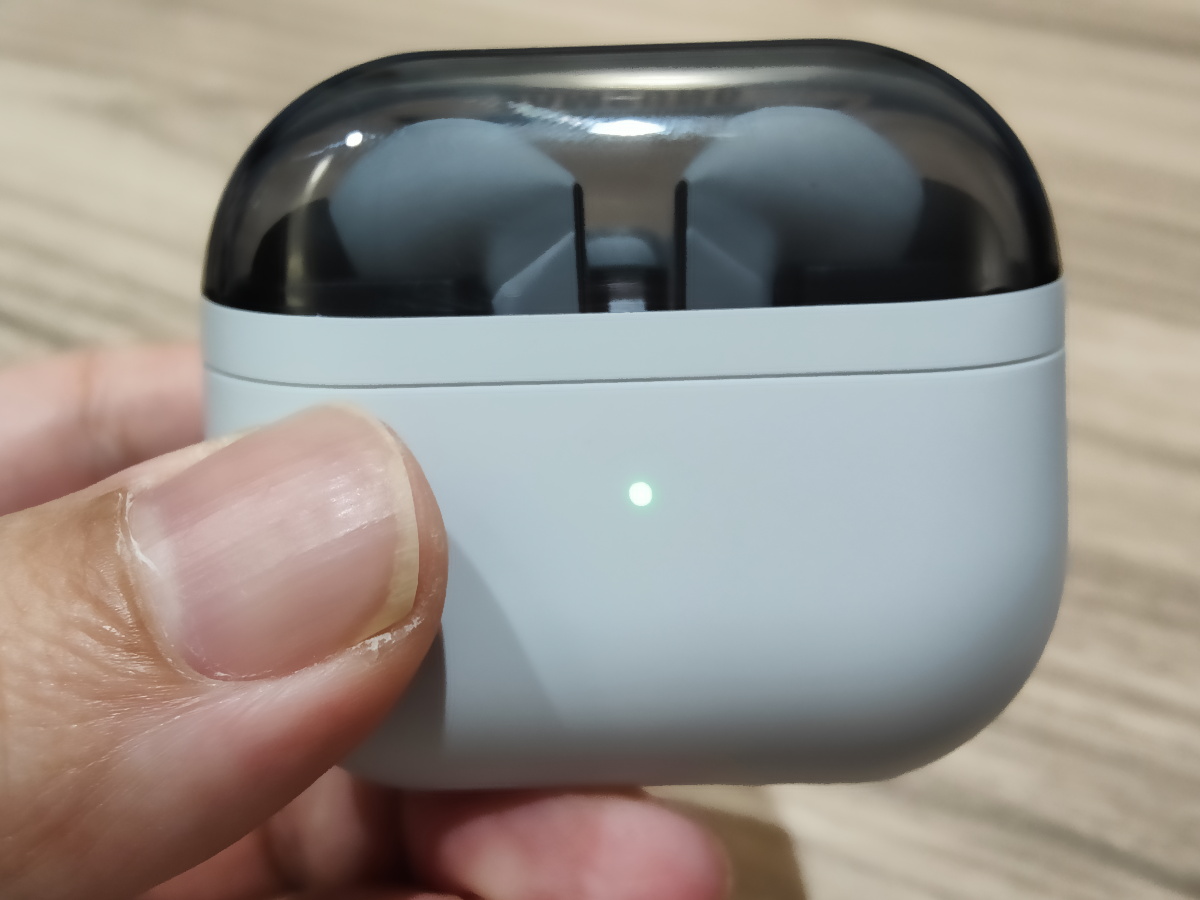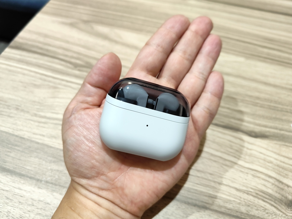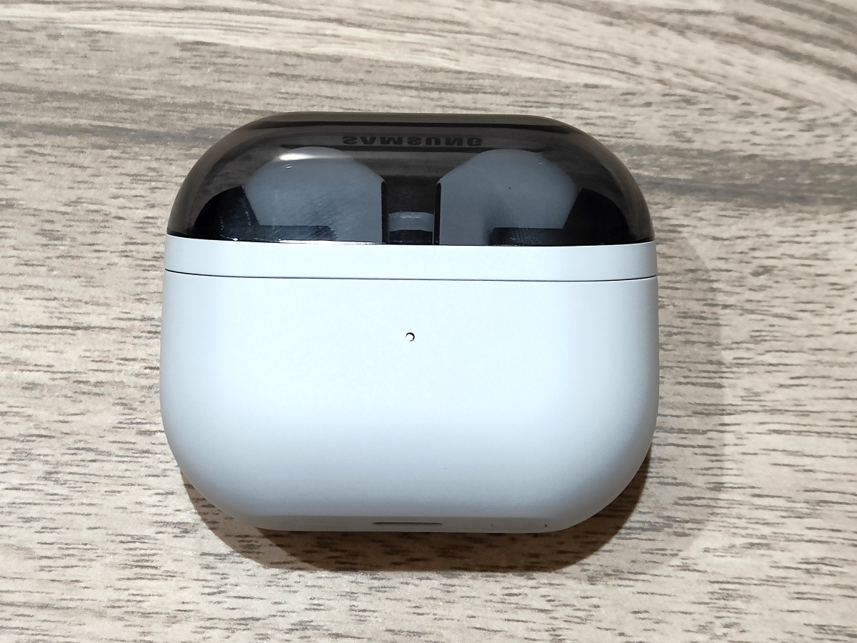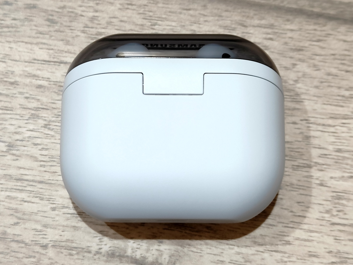 充電ケースの蓋は半透明で、ケース本体部分はサラサラとした質感のマット仕様となっている。マット部分は良い質感だが、黒ずみやすいので注意が必要だ。指で拭けば消える程度の黒ずみではあるが、新品にも関わらず少し持ち歩いただけですぐに目立つ汚れが付いてしまうため少々驚いた。