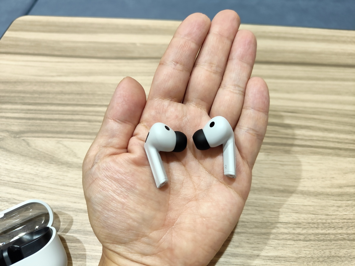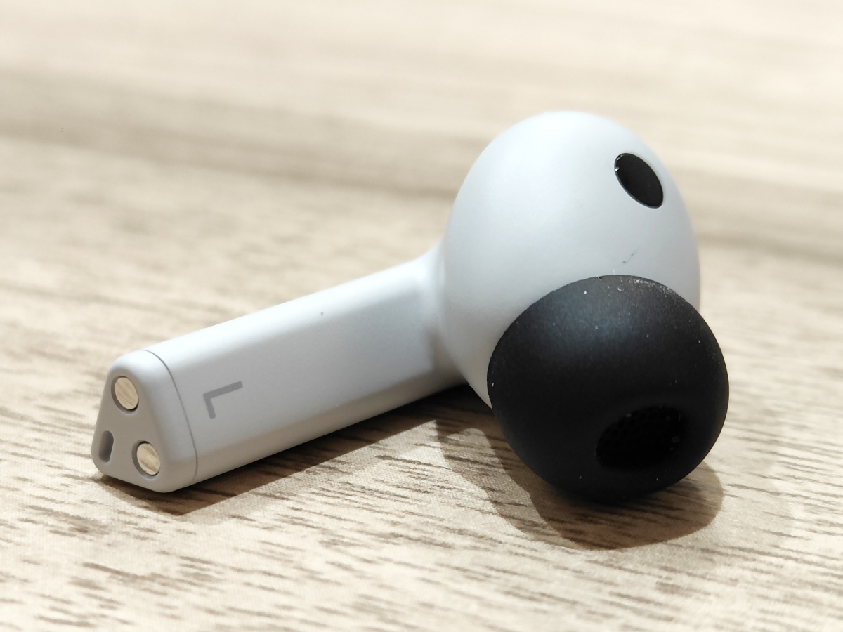 ドライバー(スピーカー)を搭載する部分は比較的大きめな球状で、そこから伸びる柄の部分は三角の形状をしている。充電ケースのマットな部分と同じようなサラサラとした手触りで心地が良い。シンプルなデザインで、他社製で数年前から見るような形状で、外観からは特に先進性は感じられないが、エントリー向けという位置づけもあり、多くの人が手に取りやすいデザインなのかもしれない。ただ、このグレーカラーに関しては、一目でこの製品だとわかるほどの特徴だと言えるだろう。