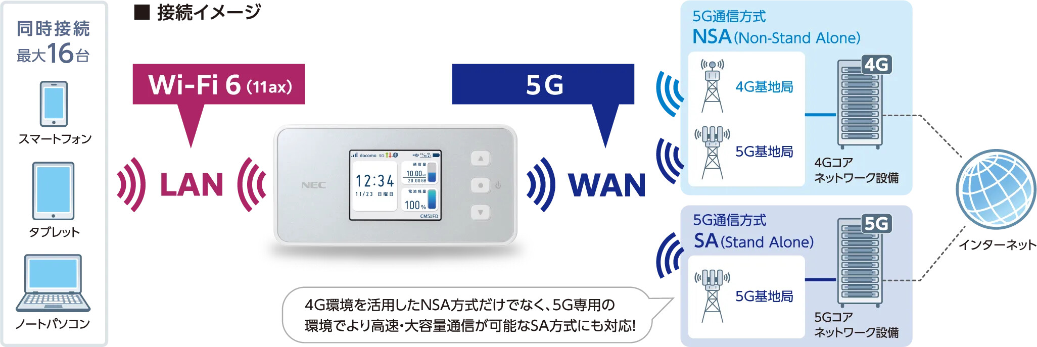 Aterm CM51FDはNECプラットフォームズが展開するAtermブランドの新しいNTTドコモ向けモバイルルーターで、WANとして5G NSA(Non-Stand Alone)に加えて5G SA(Stand Alone)に対応して下り最大3.5Gbpsおよび上り最大218Mbpsで利用でき、またLANもWi-Fi 6(IEEE802.11ax準拠)の2ストリームに対応し、スマートフォン(スマホ)やタブレット、パソコン(PC)、ゲーム機などのWi-Fi機器を16台まで同時接続することが可能です。