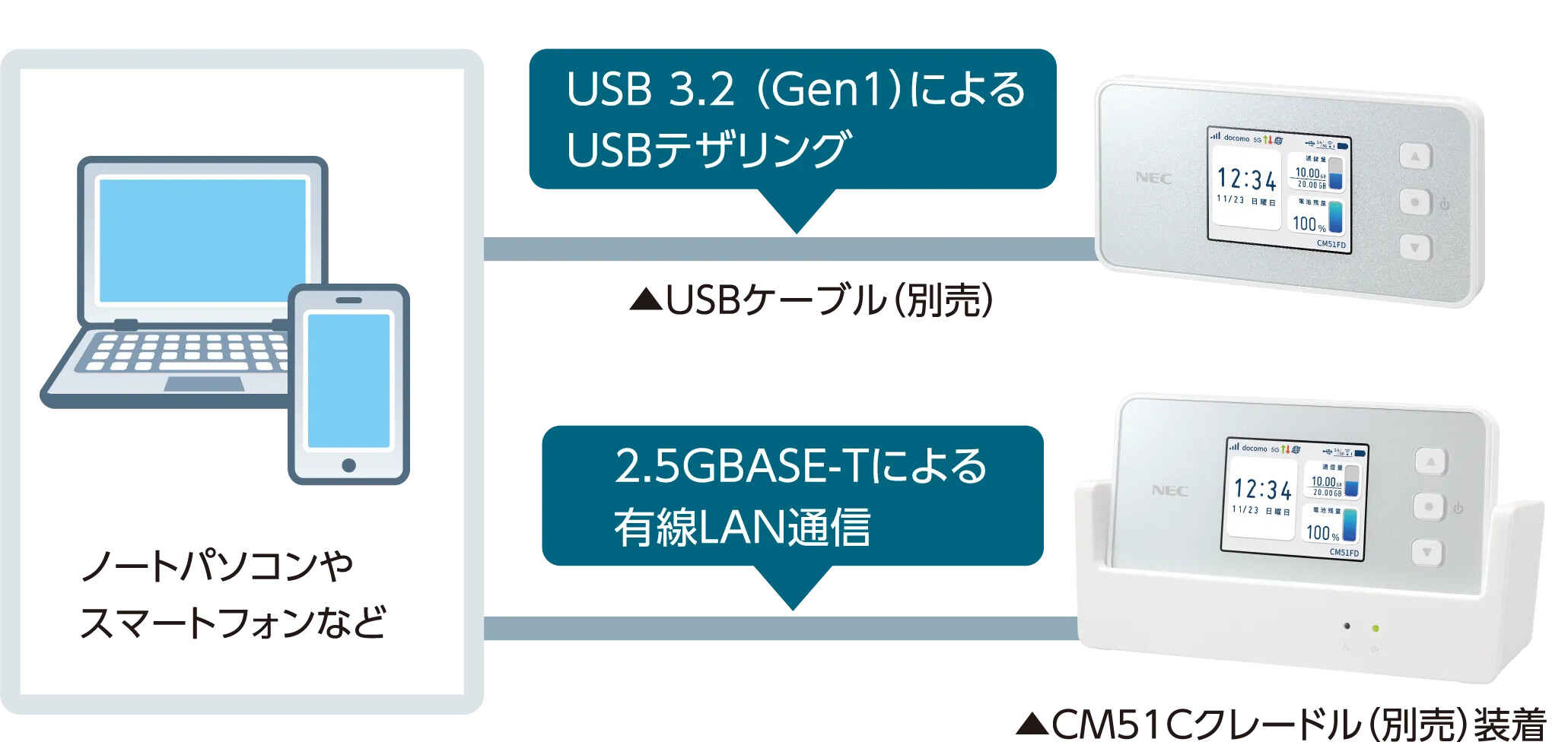 また充電・外部接続端子としてUSB Type-Cを搭載し、別売のUSBケーブルを使用することによってUSB 3.2 Gen1によるUSBテザリングが可能で、また別売オプションの専用クレードル「CM51Cクレードル」を組み合わせることによってIEEE802.3bz(2.5GBASE-T)やIEEE802.3ab(1000BASE-T)の有線LAN通信が可能になります。その他、かんたん接続機能としてWPSやQRコードによる接続に対応しています。同梱品はつなぎかたガイドおよび保証書・お問い合わせアフターサービスのみ。