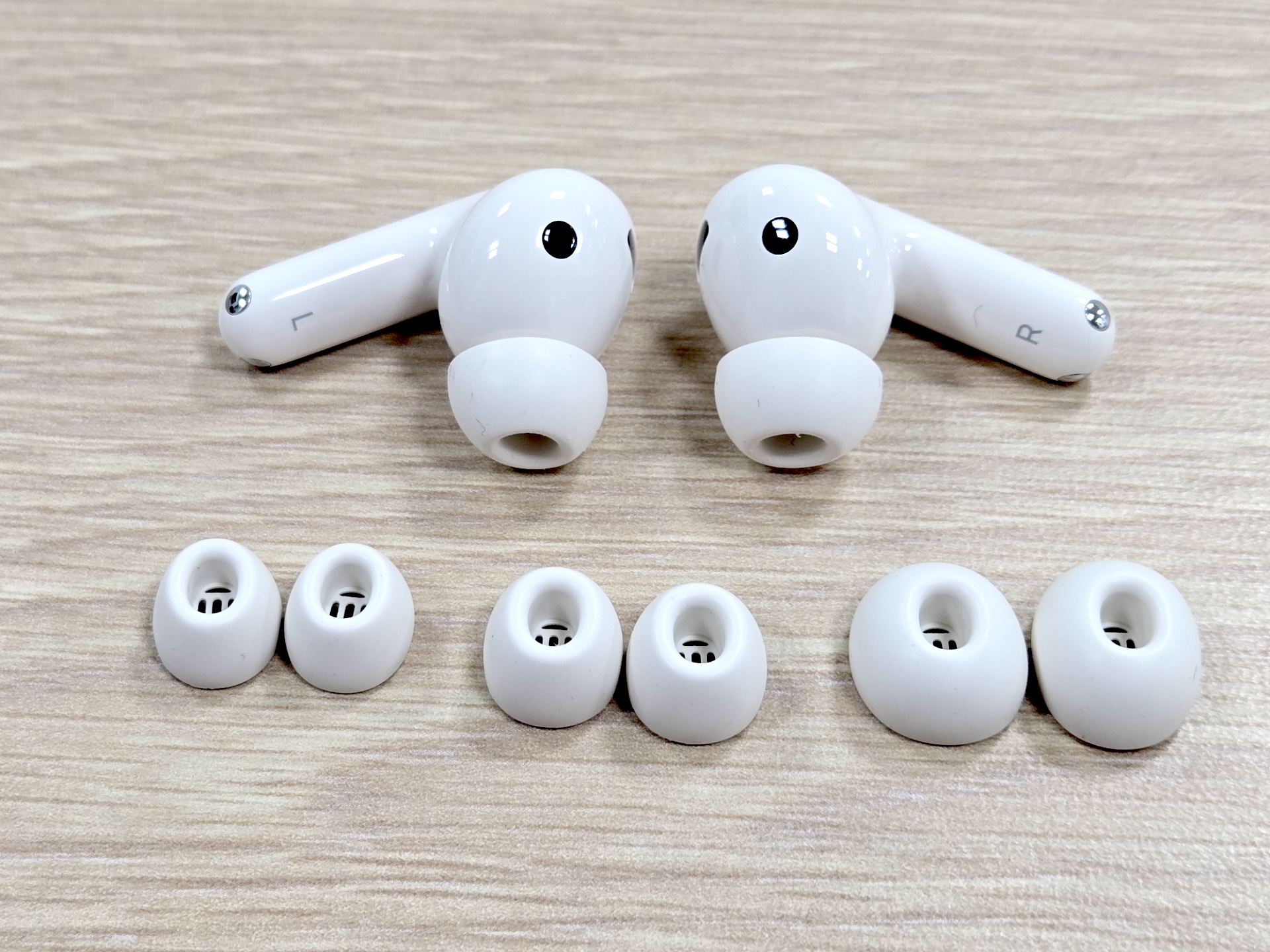 シリコン製のイヤーチップはアクティブノイキャン効果をアップするようにXSからLまで4つのサイズ(デフォルトはM)を付属しており、最適なイヤーチップの選択ができます。なお、イヤーチップに関してはアプリで適正を調べることも可能です。
