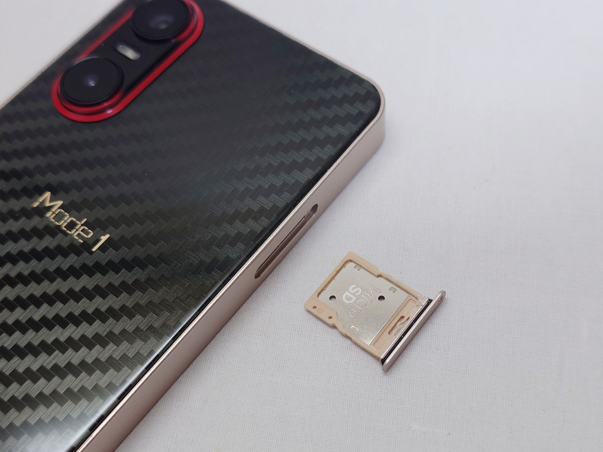 外観をチェックしていきますが、背面パネルはMode1シリーズ伝統のカーボン柄が採用されており、ガラスパネル越しに角度によって美しく輝くカーボンの質感を楽しめます。また本体カラーとしてSHIRO(白)とKURO(黒)の2色が用意されており、レッド(赤)は存在しない(過去に発売された「Mode1 RS(型番:MD-03P)」にはレッドが存在した)のが個人的に残念なところですが、筆者としてはリアカメラ部の意匠や付属のケーブルがアクセントとしてしっかりと赤いのは好印象です。