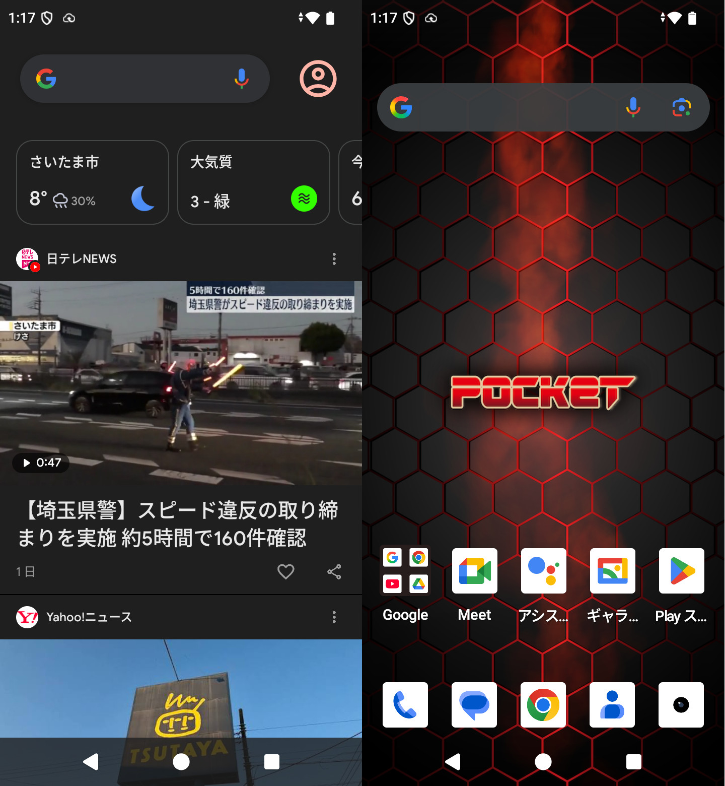 続いてソフトウェア面を見ていきます。Mode1 Pocketの初期設定直後のホーム画面は1枚で、それに加えて左側に「Google Discover」があります。ホーム画面のカメラアプリ以外はGoogleの提供するいわゆる「Google Mobile Service」(以下、GMS)の各種サービスのアプリのみとなっています。またプリインストールアプリも目立ったものはFMラジオ(ワイドFM対応)くらいで、残りはGMSアプリのみと、非常にシンプルです。
