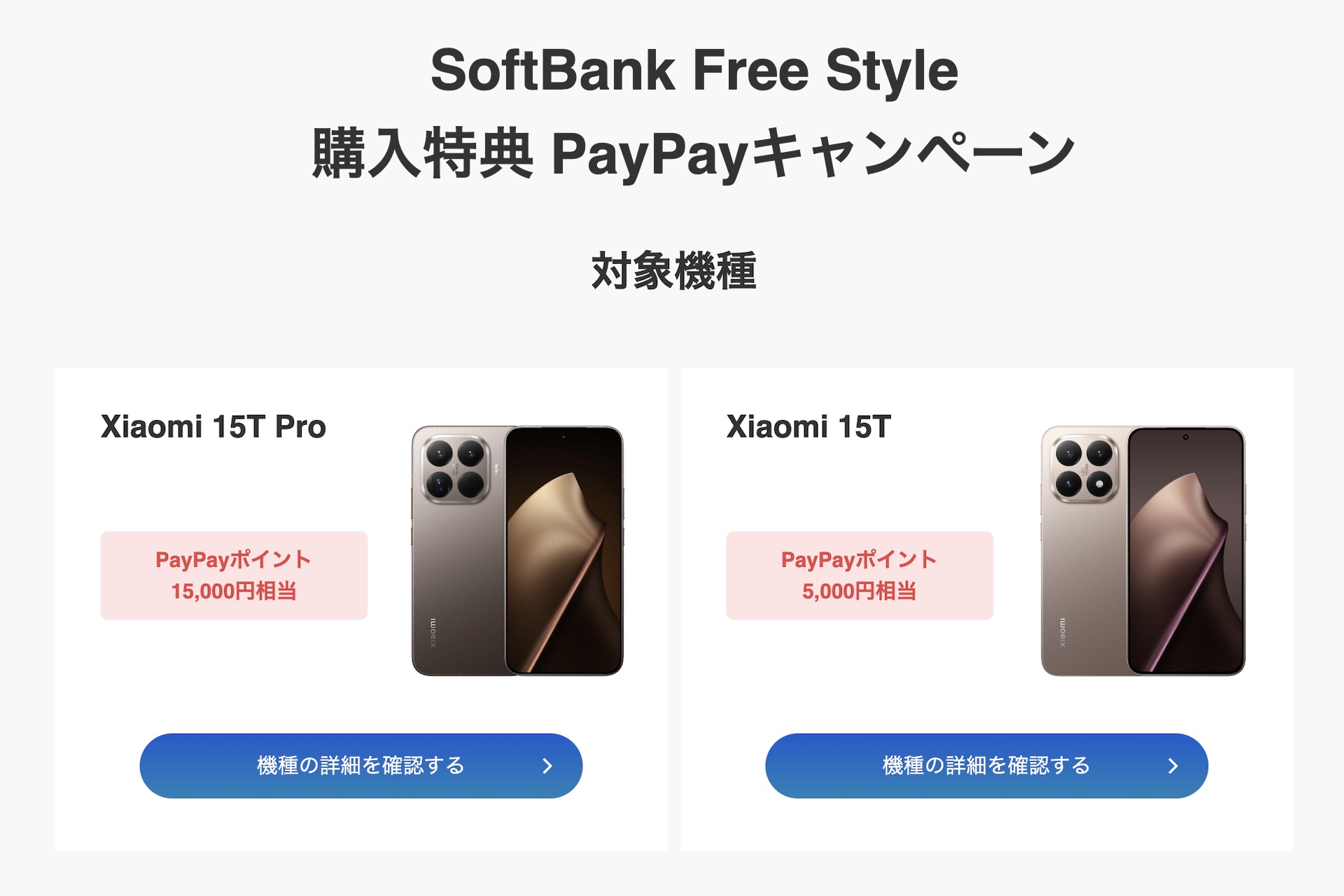 また提供開始を記念して「SoftBank Free Style 購入特典 PayPayキャンペーン」( https://www.softbank.jp/online-shop/special/products/features/freestyle/ )を終了時期未定で実施しており、SoftBank Free StyleにてXiaomi 15Tを購入すると5,000円相当、Xiaomi 15T Proを購入すると15,000円相当の「PayPayポイント」がプレゼントされています。なお、SoftBank Free Styleにおける価格(金額はすべて税込)はXiaomi 15T Proが109,872円、Xiaomi 15Tが64,800円で、販売されている本体色はXiaomi 15T Proがモカゴールド、Xiaomi 15Tがローズゴールドの各1色のみとなっています。