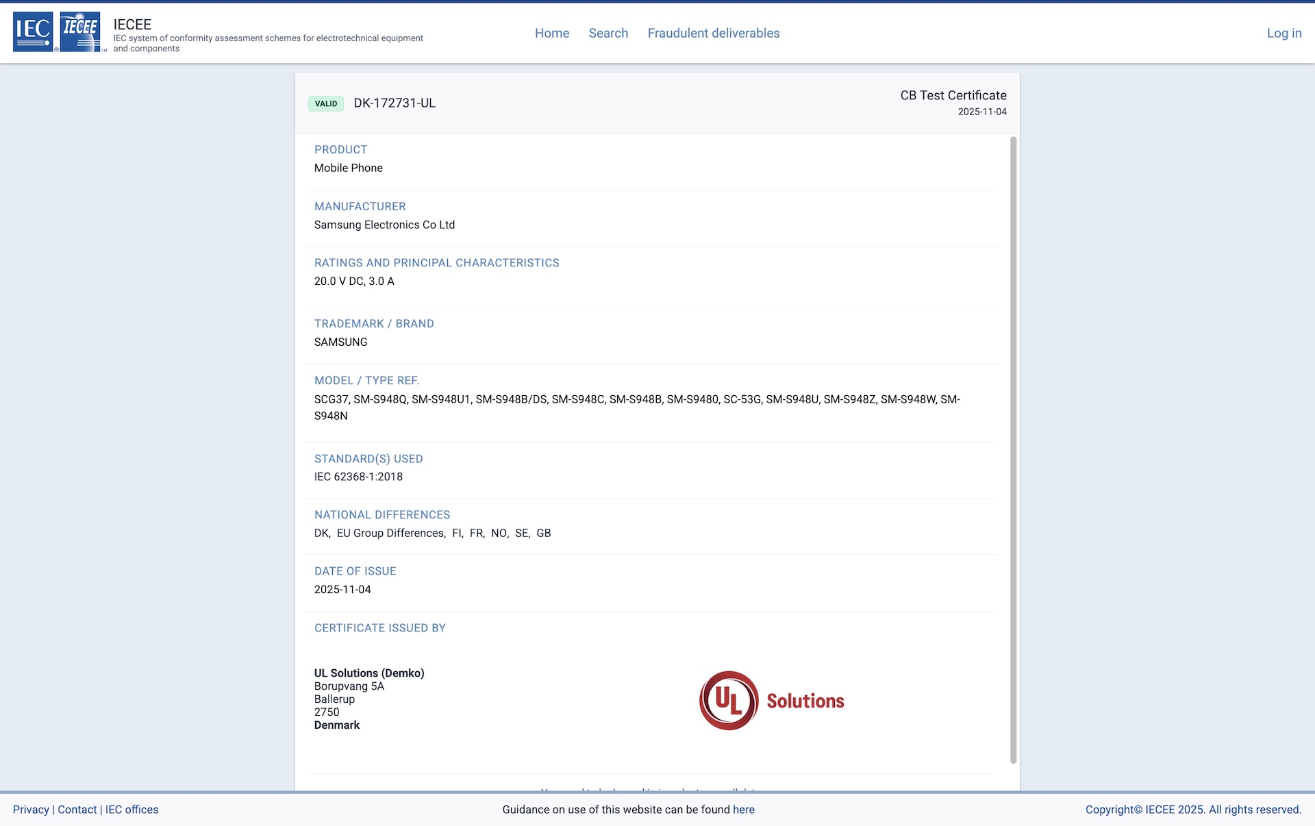 IEC(国際電気標準会議)の電気機器安全規格適合試験制度を運営するIECEEにてデンマークの認証機関「DEMKO」における検査をSamsung Electronics(以下、Samsung)が展開する「Galaxy」ブランドの次期フラッグシップスマートフォン(スマホ)「Galaxy S26 Ultra」が通過したことが公開されていました。認証日は2025年11月4日(火)付で、認証番号は「DK-172731-UL」。