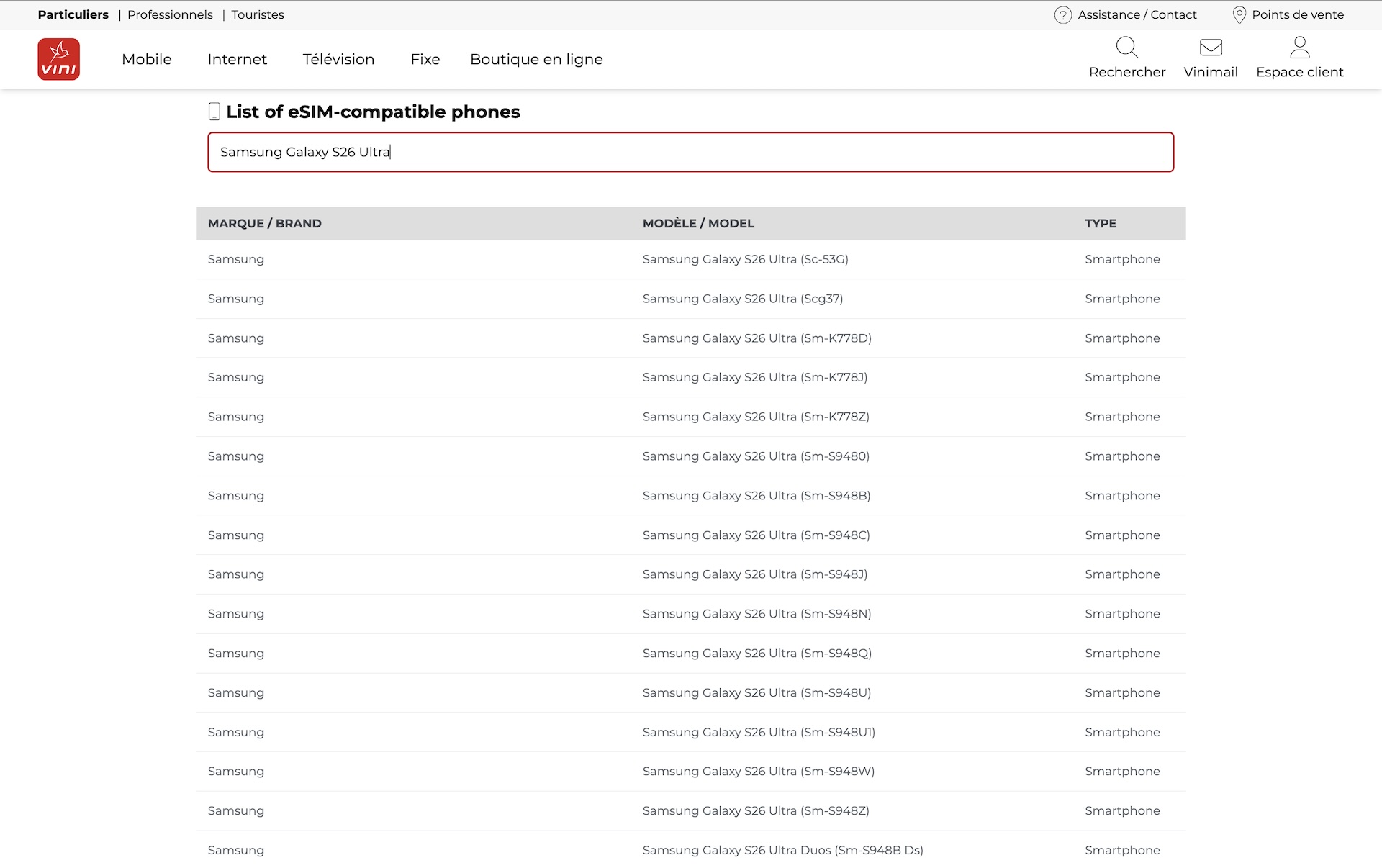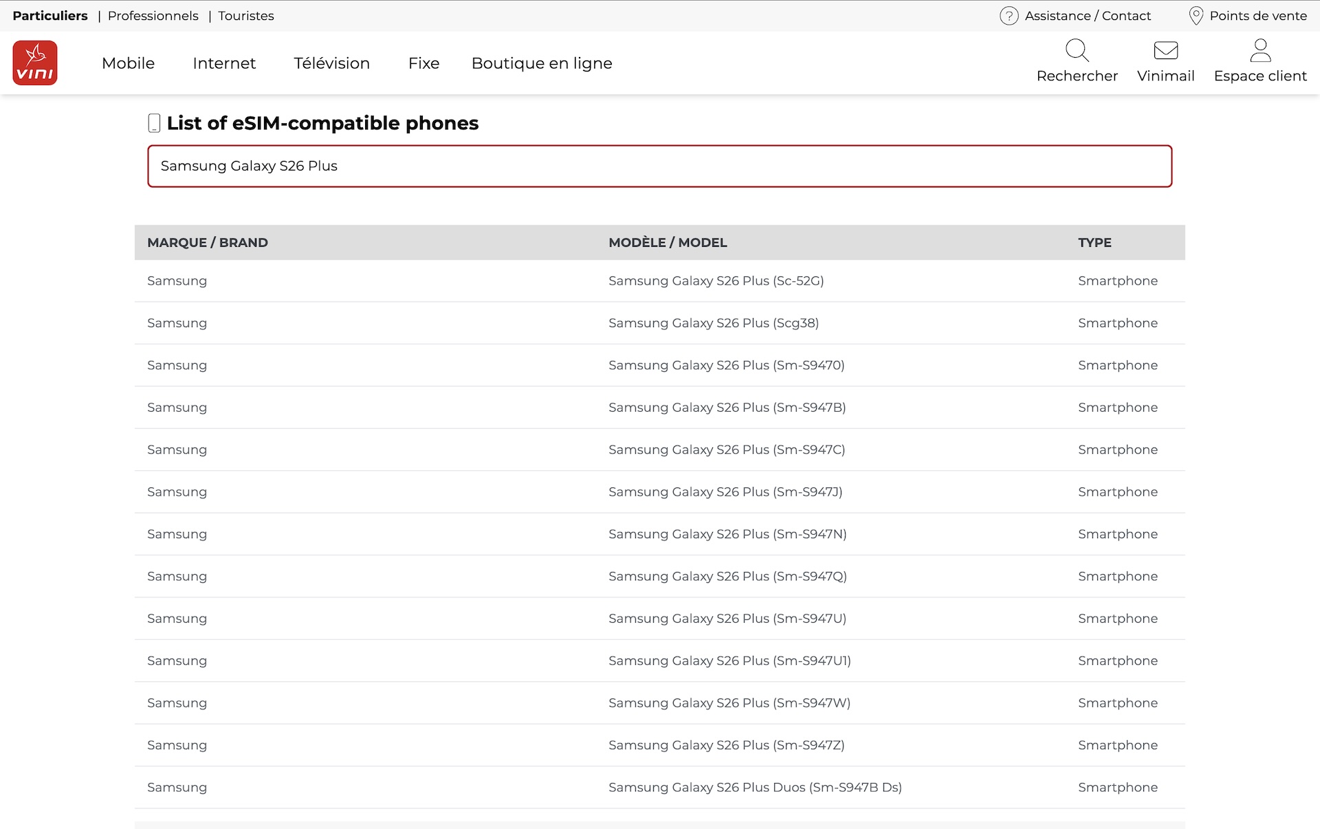 一方、フランス領ポリネシアにおいて「Vini」ブランドで携帯電話サービスを提供している移動体通信事業者(MNO)のOnatiがeSIMの対応機種にはGalaxy S26 Ultra以外にもGalaxy S26シリーズの標準モデル「Galaxy S26」や上位モデル「Galaxy S26+」もすでに登録されており、Galaxy S26とGalaxy S26+もともに日本のオープン市場向け「SM-S942Q」および「SM-S947Q」、NTTドコモ向け「SC-51G」および「SC-52G」、KDDIおよび沖縄セルラー電話向け「SCG36」および「SCG38」、ソフトバンク向け「SM-S942Z」および「SM-S947Z」、楽天モバイル向け「SM-S942C」および「SM-S947C」が記載されています。