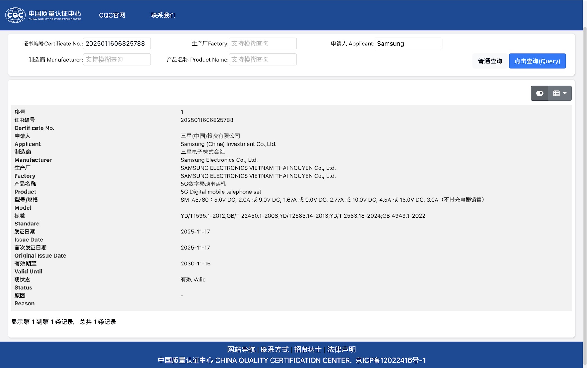 なお、他にも中華人民共和国(以下、中国)の国家認証認可監督管理委員会(CNCA)の委託を受けて認証や審査登録を実施する機関である中国質量認証中心(China Quality Certification Centre:CQC)では2025年11月17日(月)付で「SM-A5760」が中国強制製品認証(China Compulsory Certification:CCC)を通過していることが公開されているほか、SM-A5760は中国の国務院に属する工業和信息化部(Ministry of Industry and Information Technology:MIIT)でも2025年12月19日(金)付で認証されています。