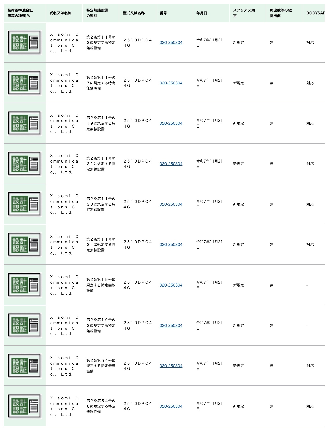 総務省が「技術基準適合証明等を受けた機器の検索」のデータベースを更新し、新たにXiaomi Communications(以下、Xiaomi)が「POCO」ブランドの最新フラッグシップスマートフォン(スマホ)「POCO F8 Pro」のグローバル向けモデル「POCO F8 Pro(型番:2510DPC44G)」の電波法に基づく工事設計認証(いわゆる「技適」)を2025年11月21日(金)付けでTAC(旧:タコヤキ)によって取得しています。認証番号は「020-250304」。