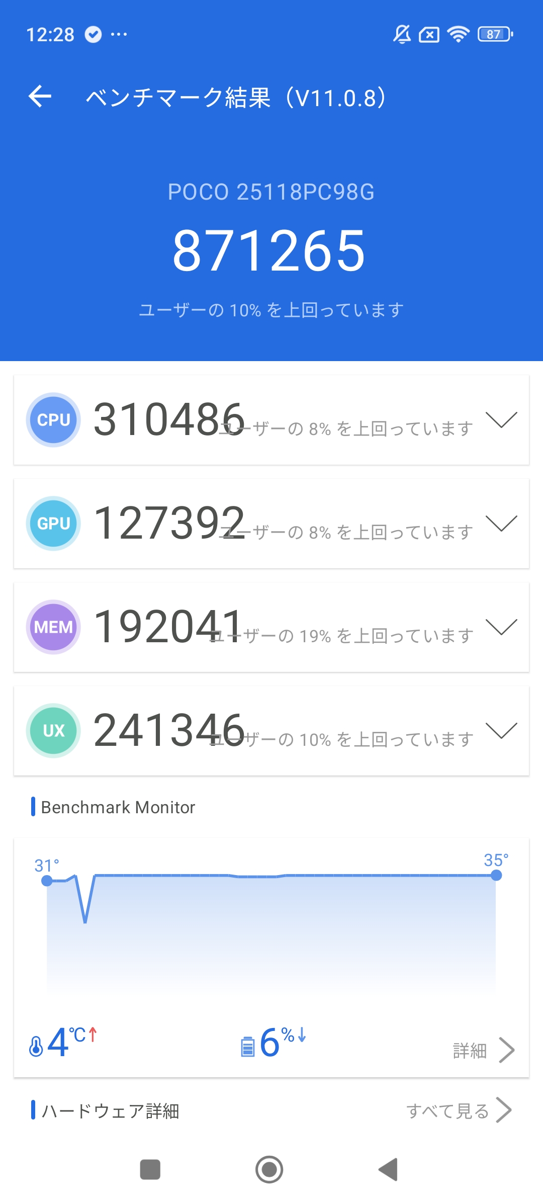 SoCは前述通りにSnapdragon 6 Gen 3を採用しており、4nmプロセスを採用した5Gプロセッサーによって高いパフォーマンスと低い消費電力を両立し、ベンチマークアプリ「AnTuTu Benchmark」では総合スコアが80万ポイント台でした。Snapdragon 6 Gen 3を搭載したスマホは日本では「Xperia 10 VII」や「Galaxy A36 5G」などがありますが、どちらもメーカー版は7万円台や5万円台となっており、機能面の違いや後発で発売されたことを考えてもPOCO M8 5Gの価格の安さが際立ちます。