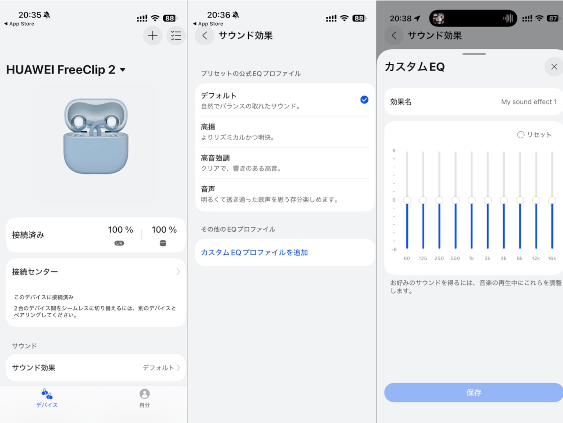 イヤホン自体も軽くなり、片耳の質量が前機種の約5.6gから約5.1gと軽量化しました。さらに自社開発デュアル振動板ドライバーを搭載することによって最大音量が約2倍となり、低音から高音までより迫力と臨場感のあるサウンドとなりました。またスマートフォン(スマホ)など向けアプリ「HUAWEI Audio Connect」または「HUAWEI AI Life」で各種設定が可能で、音質に関しては「サウンド効果」にてプリセットされているモードに加え、イコライザーにて細かな設定ができます。