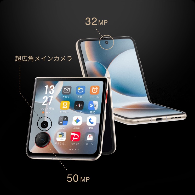 バッテリー容量もnubia Flip 2の4310mAhからnubia Flip 3では4610mAhに増量されて電池持ちが若干良くなっており、急速充電に対応しています。その他の仕様はUSB Type-C端子、Wi-Fi 6Eに対応したIEEE802.11a/b/g/n/ac/ax準拠(2.4および5、6GHz)の無線LAN、Bluetooth 6.0、NFC Type A/B、位置情報取得(A-GNSS、GPS、GLONASS、Galileo、BDS、QZSSなど)、緊急速報メール、国際ローミングなど。3.5mmイヤホンマイク端子やFMラジオ、ワンセグ、フルセグは非対応。
