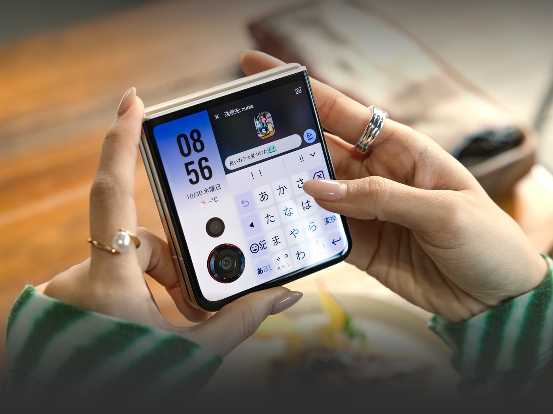 nubia Flip 3はnubiaブランドにおける新しい縦開き型フォルダブルスマホで、一昨年に発売されたnubia初のフォルダブルスマホ「nubia Flip 5G」やそれに続く「nubia Flip 2」の後継機種として同様に開くと普通のスマホとして使え、閉じてコンパクトに持ち運べる縦折りタイプのミドルレンジスマホとなっています。既存機種のnubia Flip 5Gは閉じた状態でも使えるサブディスプレイが円形でしたが、新たにnubia Flip 3は折り畳んだ部分のほぼ全面となって大画面化しています。
