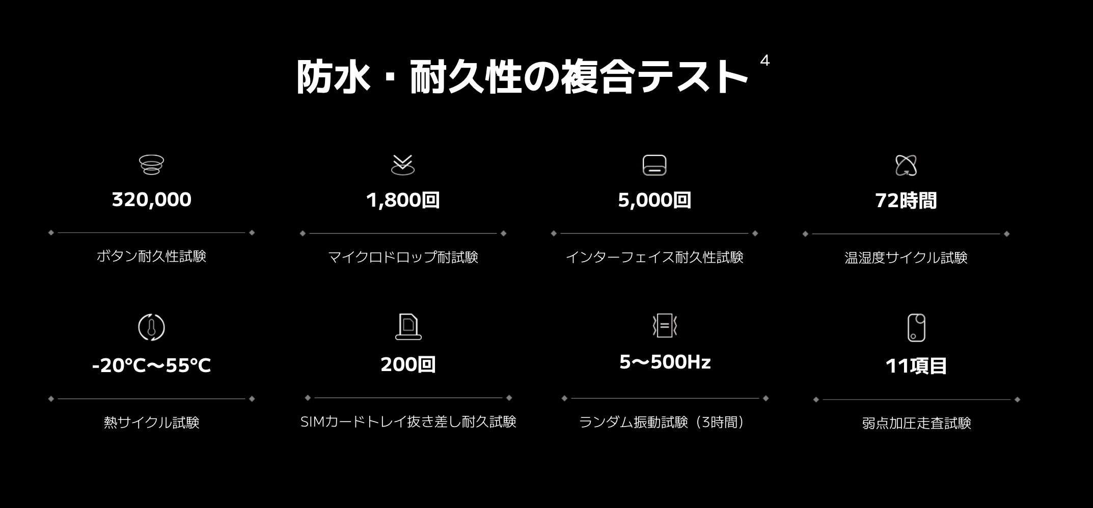 | 防水/防塵/耐衝撃 | ○(IPX6・IPX8)/○(IP6X)/○(SGS) |
