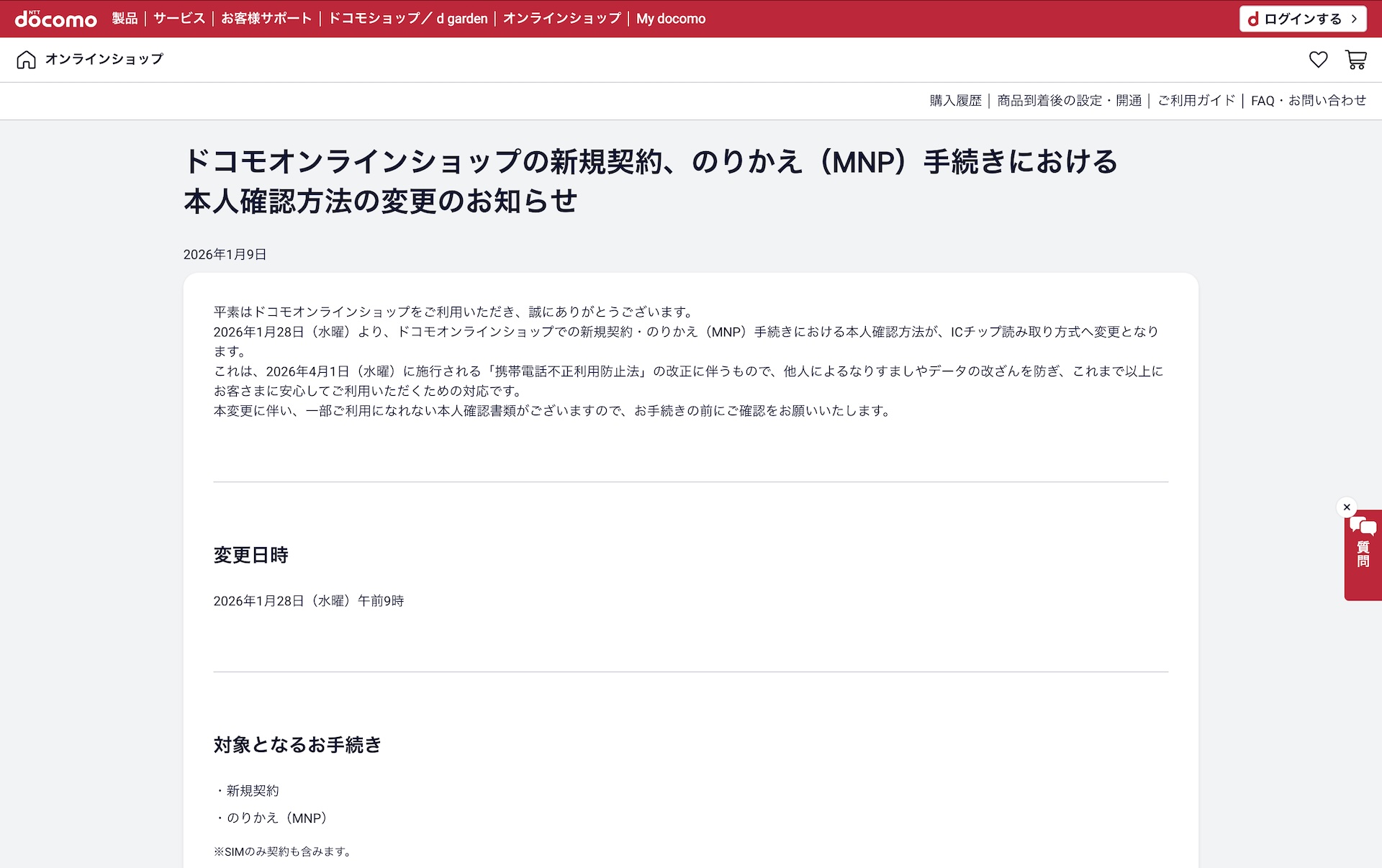 | ドコモオンラインショップで新規契約・MNPの本人確認が1月28日9時よりICチップの読み取りのみに! |