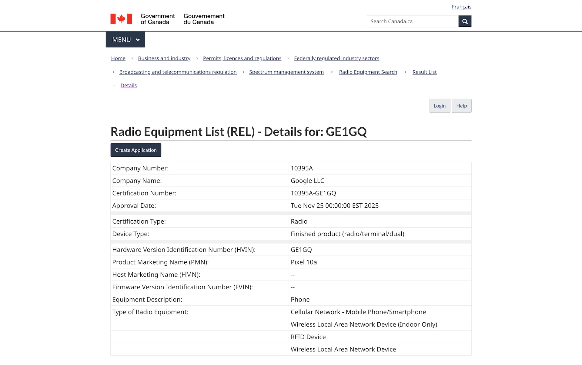 一方、カナダの無線通信関連の認証情報を掲載しているデータベース「Radio Equipment List(REL)」にこれらの型番のうちのGE1GQが登録され、認証情報に「Pixel 10a」であることが記載されているため、これらの製品がPixel 10aになることが確定しました。認証番号は「10395A-GE1GQ」、承認日は現地時間(EST)の2025年11月25日(火)とのこと。