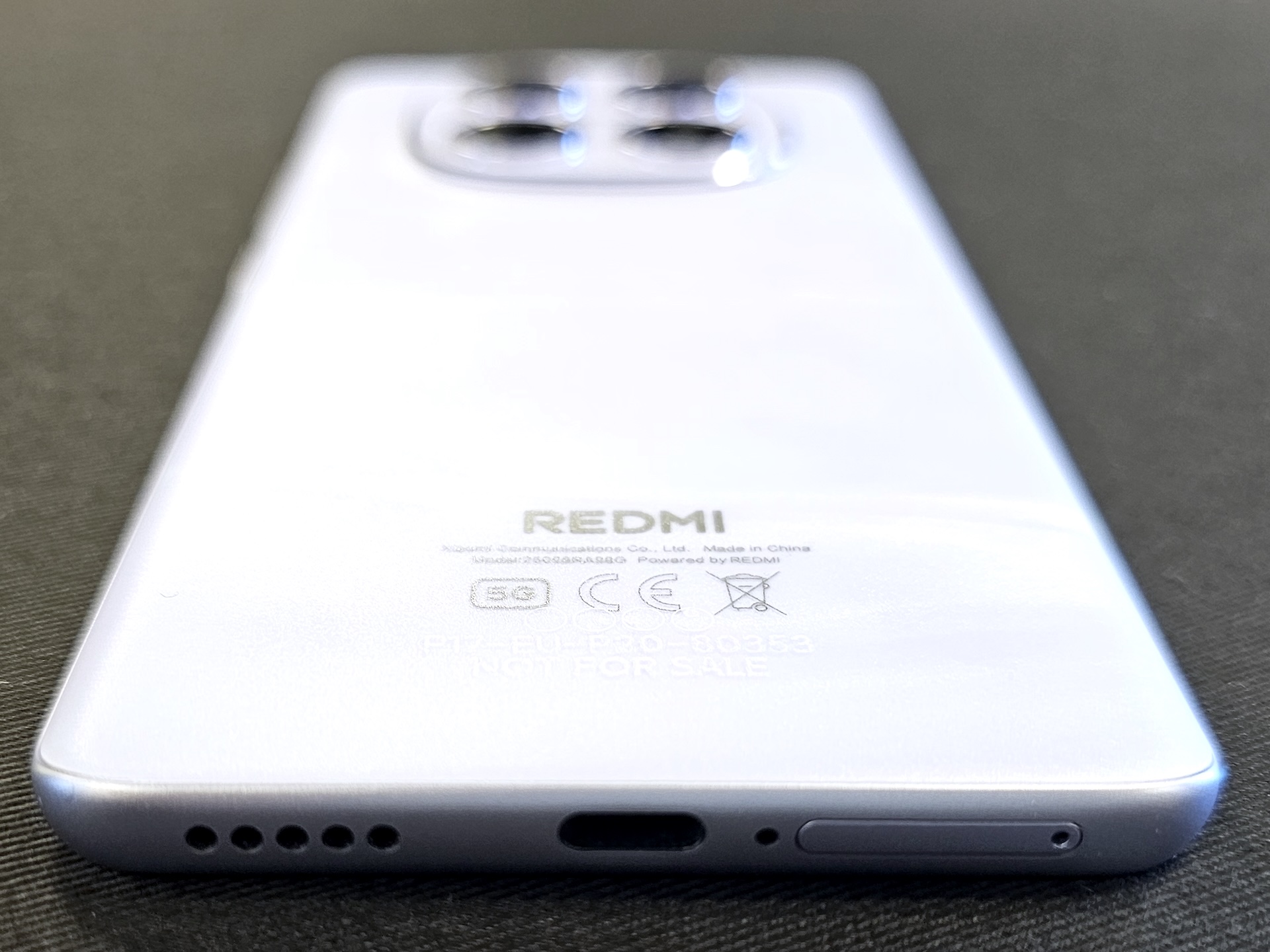REDMI Note 15 5Gの下側面にスピーカー穴や通話口(メインマイク)、USB Type-C端子、nanoSIMカードおよびmicroSDカードのスロットトレイが配置されています。3.5mmイヤホンマイク端子は非搭載