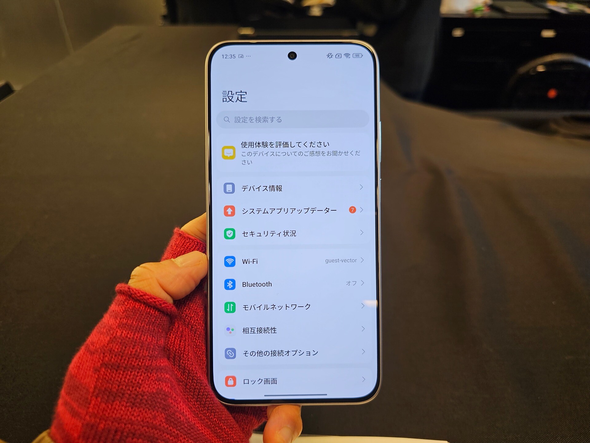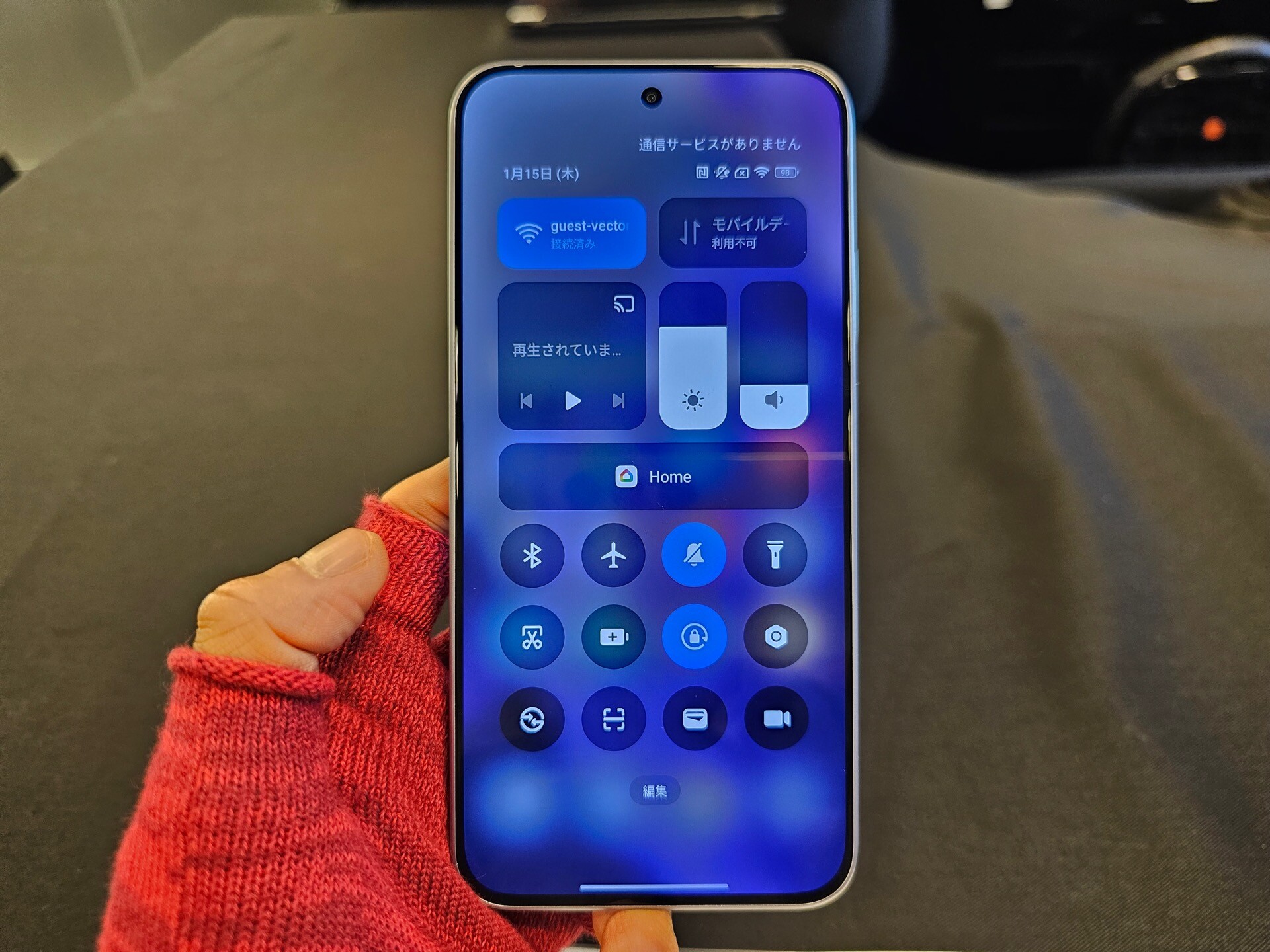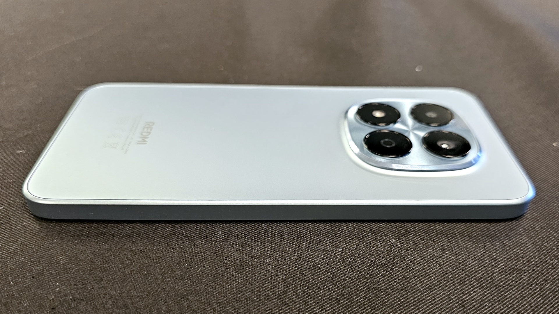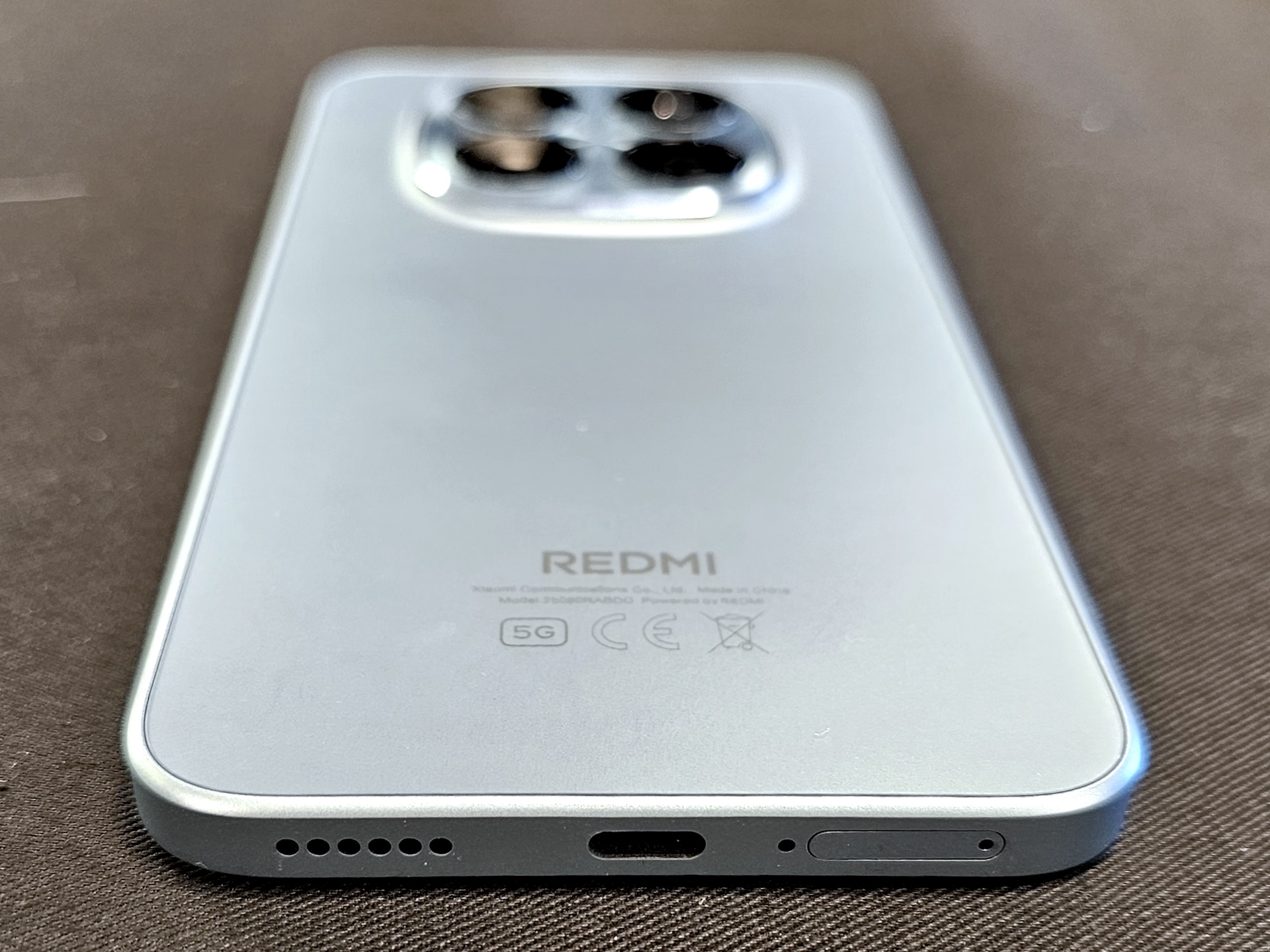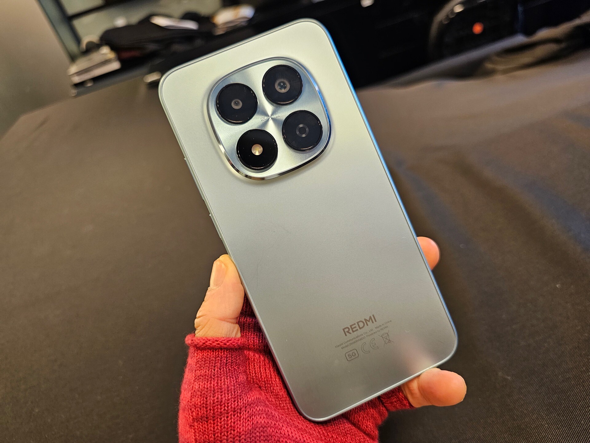 REDMI Note 15 Pro 5Gを背面側にして持ってみたところ。背面は樹脂製ながらも表面加工がしっかりしており、質感はなかなか良い。なお、本来は中央左側付近におサイフケータイのマーク(アンテナ)が記載されていますが、試験機なのでそれがありません
