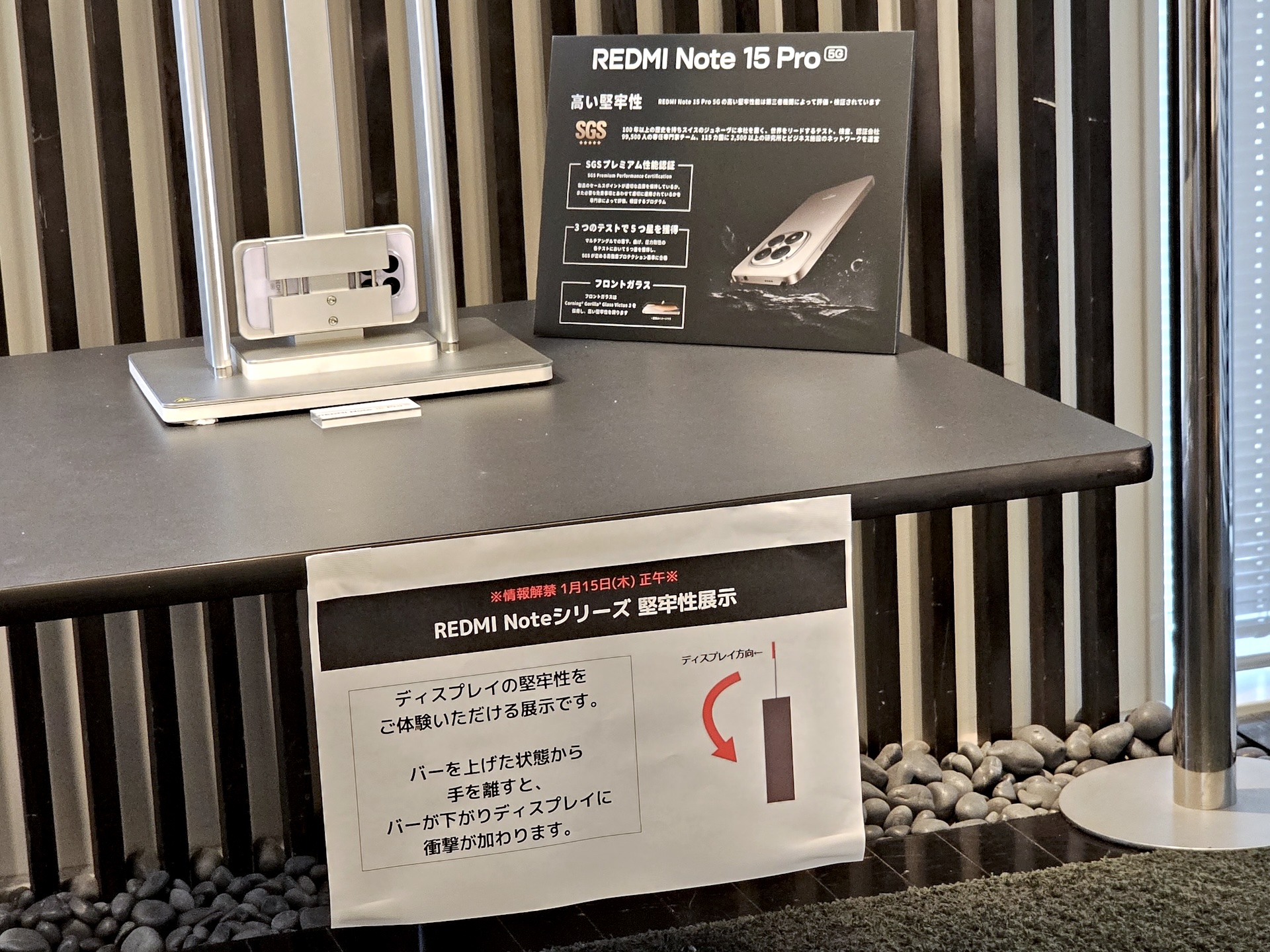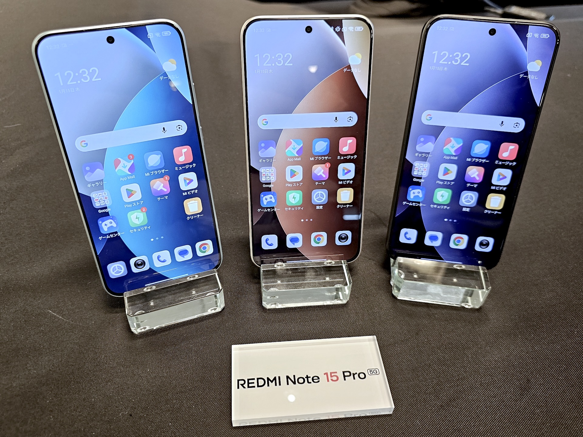 カラーバリエーションは左からグレイシャーブルー、チタングレー、ブラックの3色展開。なお、展示されていた試験機にはREDMI Note 15 5GのミストパープルのようなカラーリングのREDMI Note 15 Pro 5Gもあり、やや混乱を招く状況に