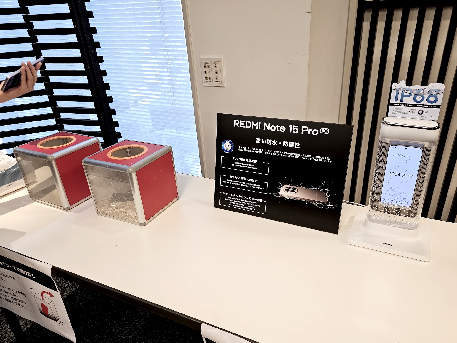 防水・防塵性能のデモも行われており、防水についてはIPX8(水深1mで30分間)を超えるTÜV SÜDに基づいた水深2m・24時間の耐水テストもクリアしているとのことで、ストップウォッチですでに17時間を超えた状態を展示していました