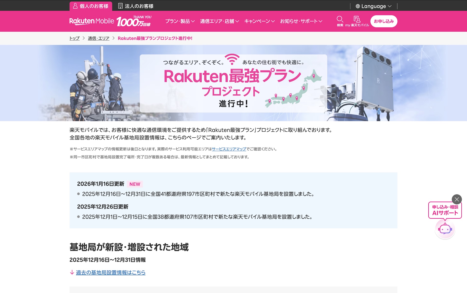 楽天モバイルは16日、同社が移動体通信事業者(MNO)として自社回線(以下、楽天回線)を構築して提供している携帯電話サービス( https://network.mobile.rakuten.co.jp/ )において2023年7月より実施している「Rakuten最強プラン」プロジェクトとして新たに2025年12月16日(火)から12月31日(水)までに全国41都道府県197市区町村で基地局を設置したとお知らせしています。