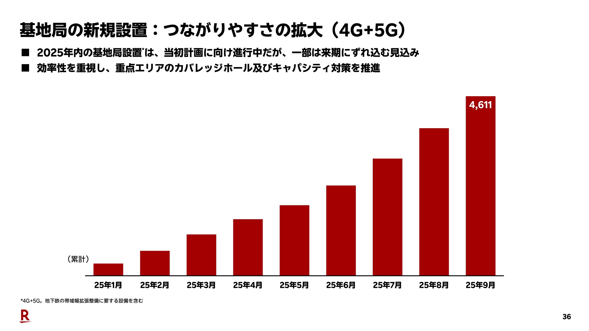 またすでに紹介しているように2025年3月末時点で基地局(4G+5G)を9.4万局設置しており、さらに通信品質改善に向けて新規基地局設置を推進し、2025年内に1万局+aの追加を計画していましたが、2025年9月時点で4611局というように設置が遅れており、2H(下期)にペースアップするとしていましたが、最終的に一部は2026年にずれ込むことが案内されています。