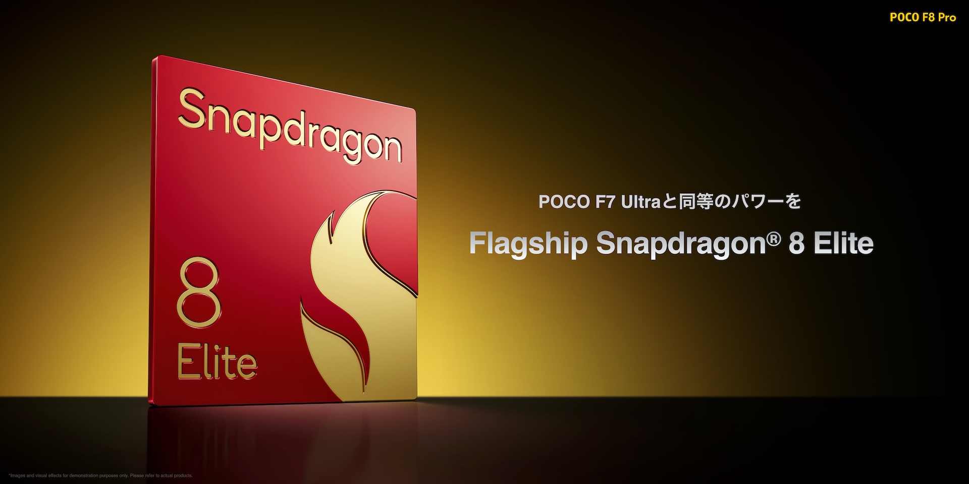 POCO F8 ProはPOCOブランドにおけるフラッグシップスマホ「POCO F」シリーズの最新機種で、日本でも昨年に前機種「POCO F7 Pro」が発売されていますが、新たにチップセット(SoC)にはPOCO F8 ProがQualcomm製「Snapdragon 8 Elite Mobile Platform」を搭載し、POCO F7 ProのQualcomm製「Snapdragon 8 Gen 3 Mobile Platform」より高性能となっており、新たにアメリカ合衆国の音響機器メーカー「BOSE(以下、ボーズ)」と提携してボーズが監修したオーディオ機能を搭載することによって究極の音響体験を実現しています。
