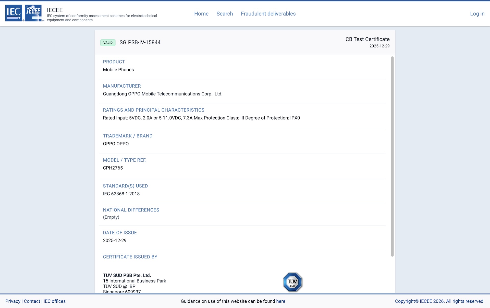 IEC(国際電気標準会議)の電気機器安全規格適合試験制度を運営するIECEEにてシンガポール共和国(以下、シンガポール)の認証機関「TÜV SÜD PSB」の検査をOPPO Mobile Telecommunications(以下、オッポ)の未発表な製品「CPH2765」が2025年12月29日(月)付で通過したことが公開されていました。認証番号は「SG PSB-IV-15844」。