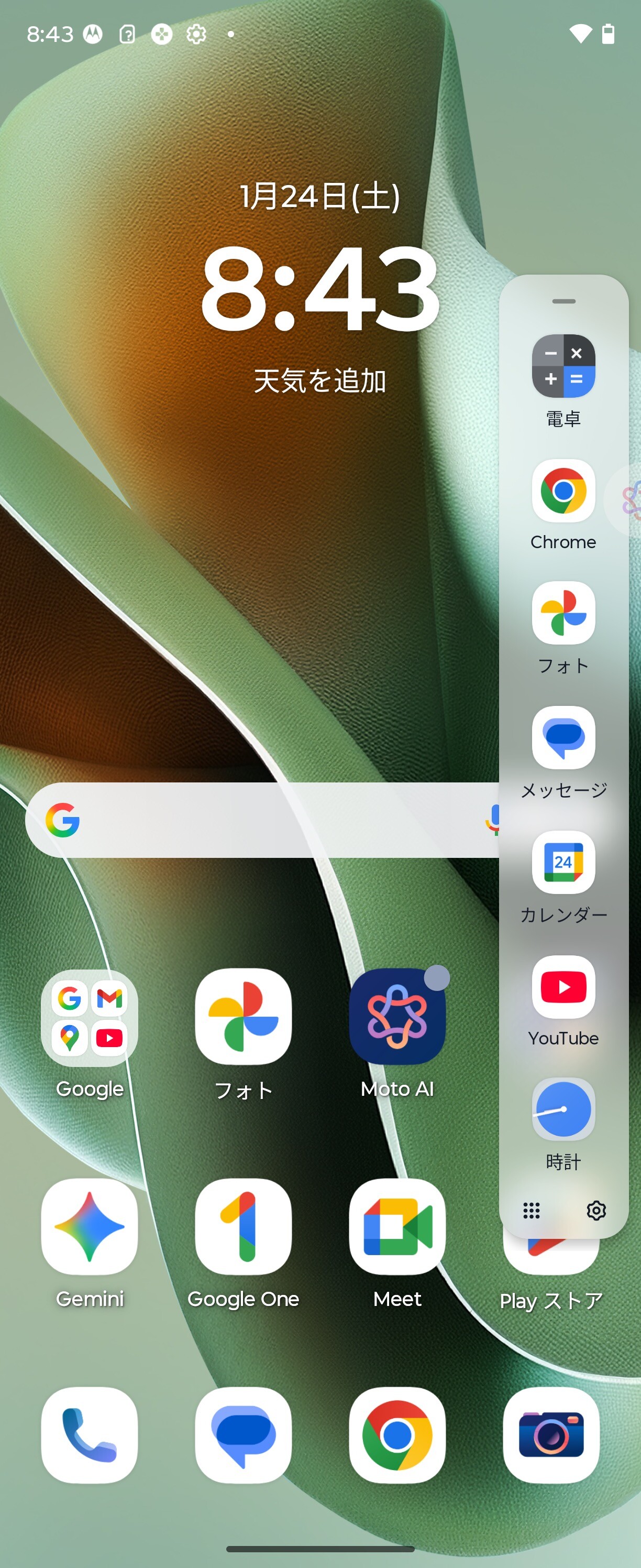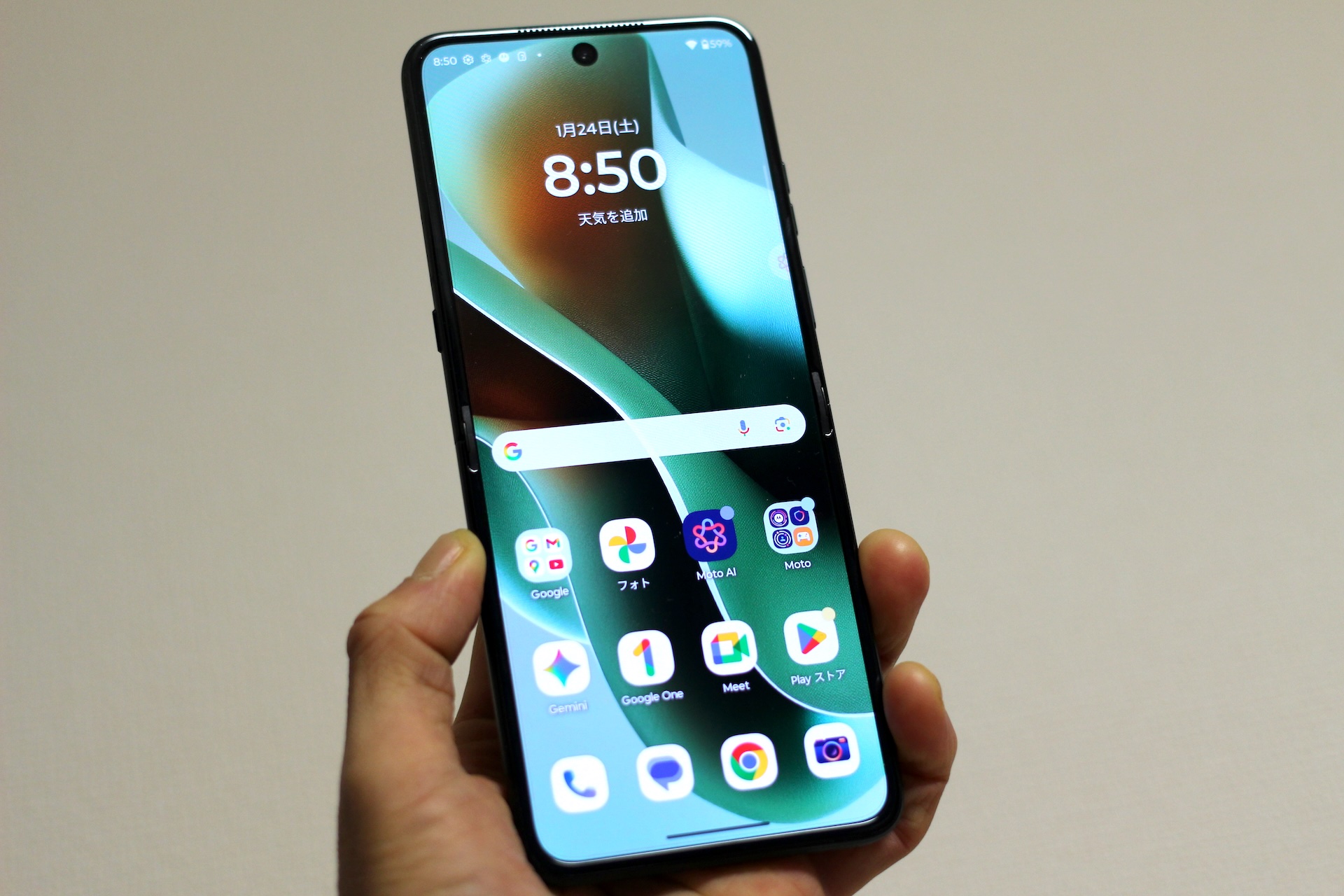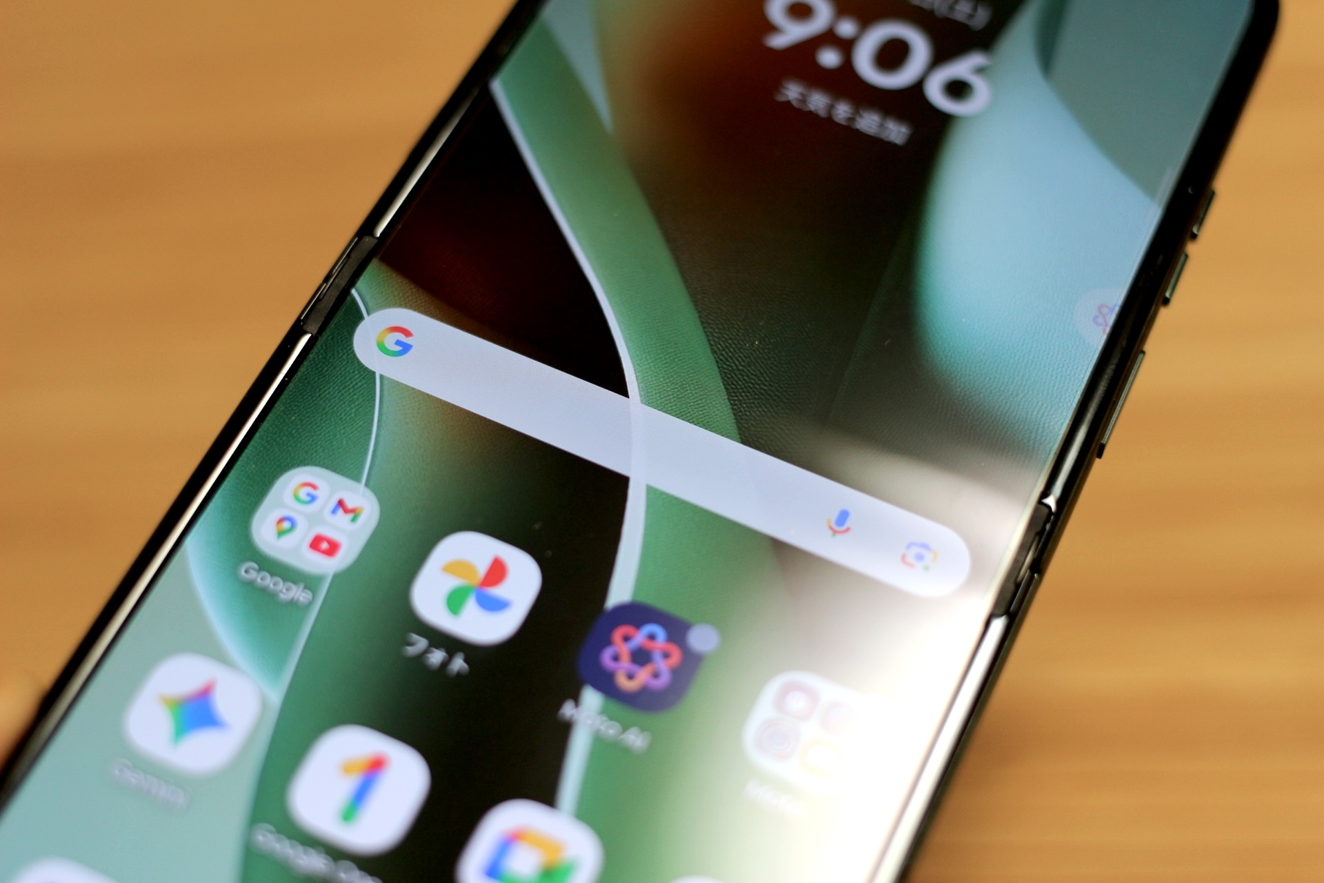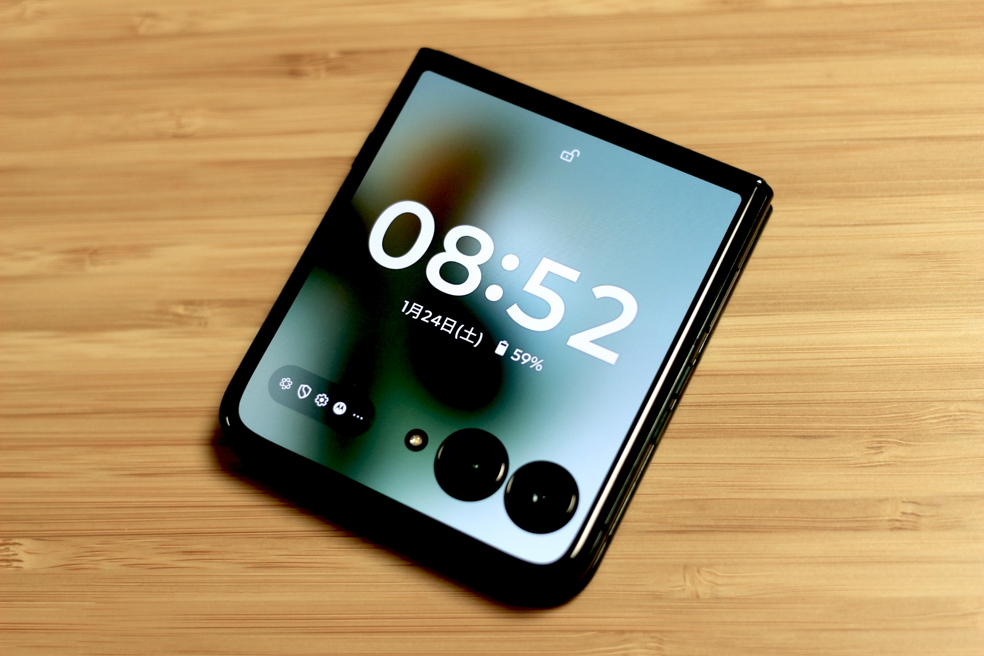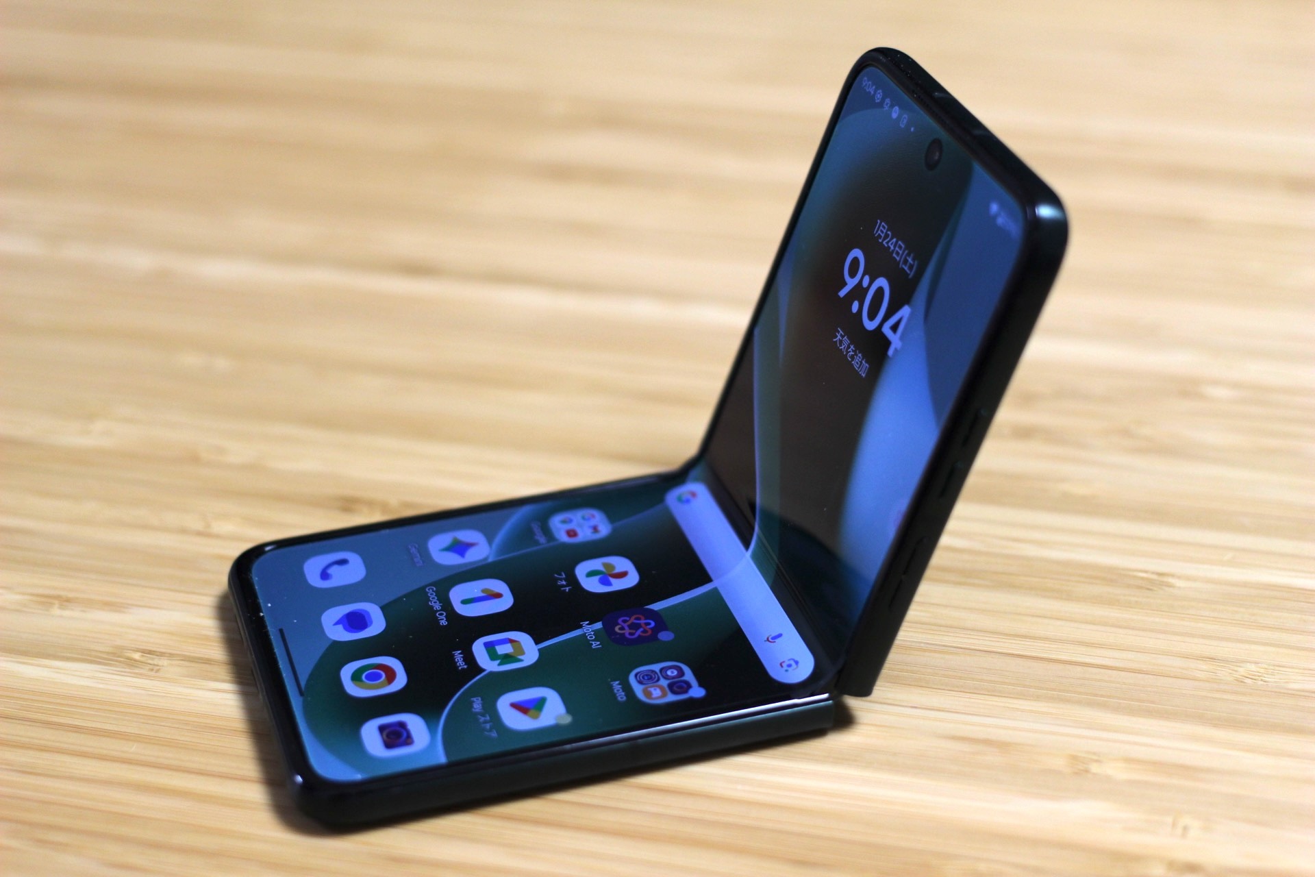 motorola razr 60 ultraを開いて画面を付けた状態の正面。画面保護フィルムが貼られており、簡単には剥がせないようにしっかりと貼られてはいますが、剥がさないように注意が出る画面も用意されています