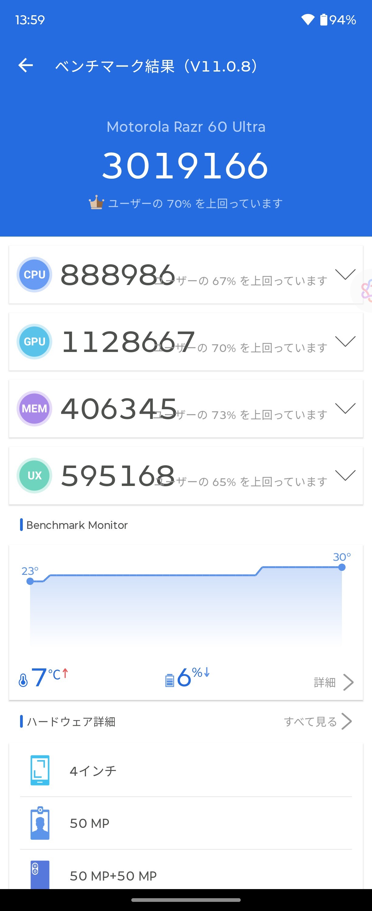 チップセット(SoC)にはQualcomm製ハイエンド向けSnapragon 8 Elite Mobile Platform」を搭載し、内蔵メモリー(RAM)はLPDDR5X規格の16GB、内蔵ストレージはUFS 4.0規格の512GB内蔵ストレージとなっており、microSDカードなどの外部ストレージスロットは搭載しておらず、内蔵ストレージを利用したRAM拡張機能に対応し、最大16GBを追加して合計32GBで使えるほか、最大16GBまでで最適なサイズを自動的に追加する「AI自動」機能にも対応しています。なお、ベンチマークアプリ「AnTuTu Benchmark」の総合スコアは300万超えとなっていました。