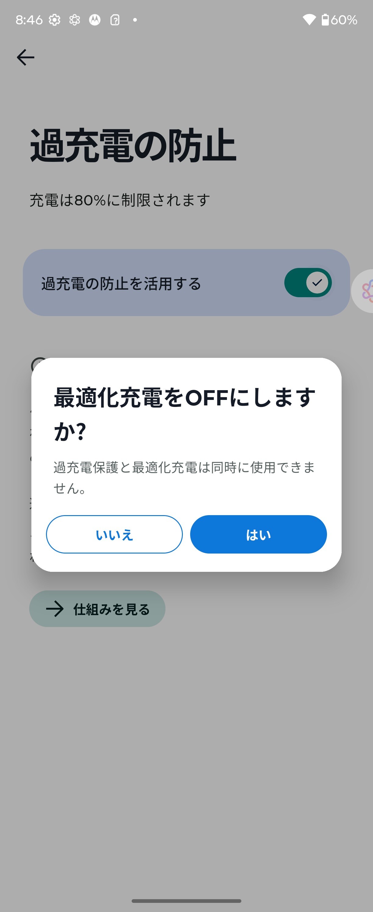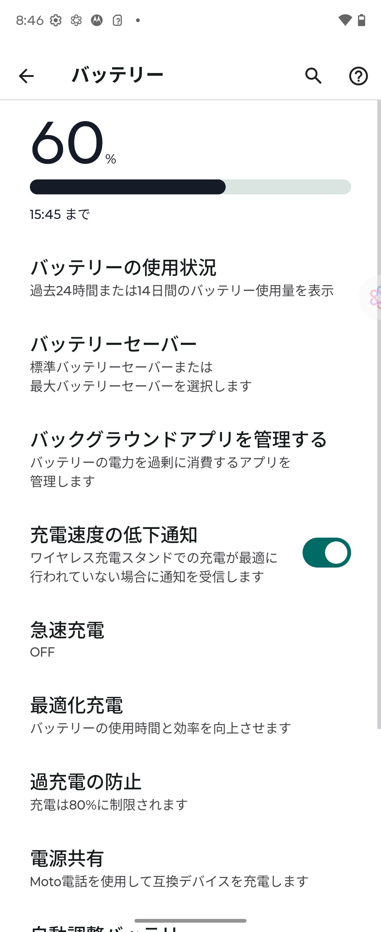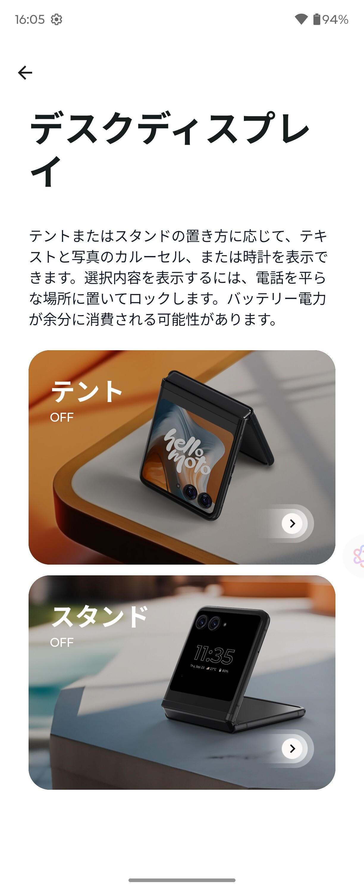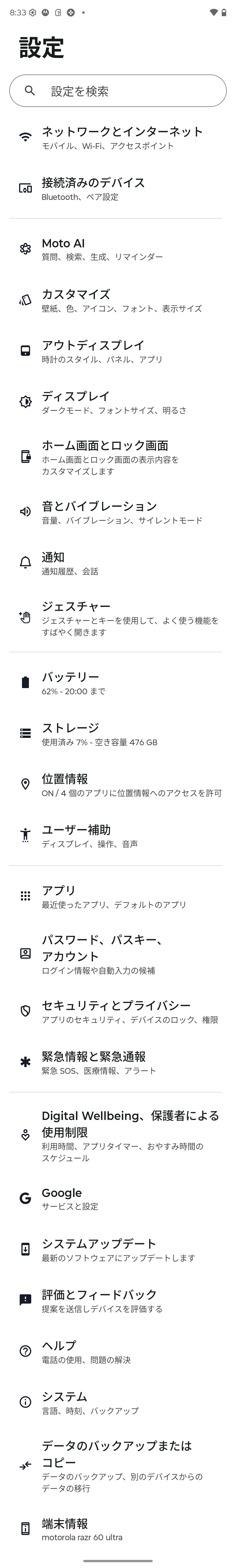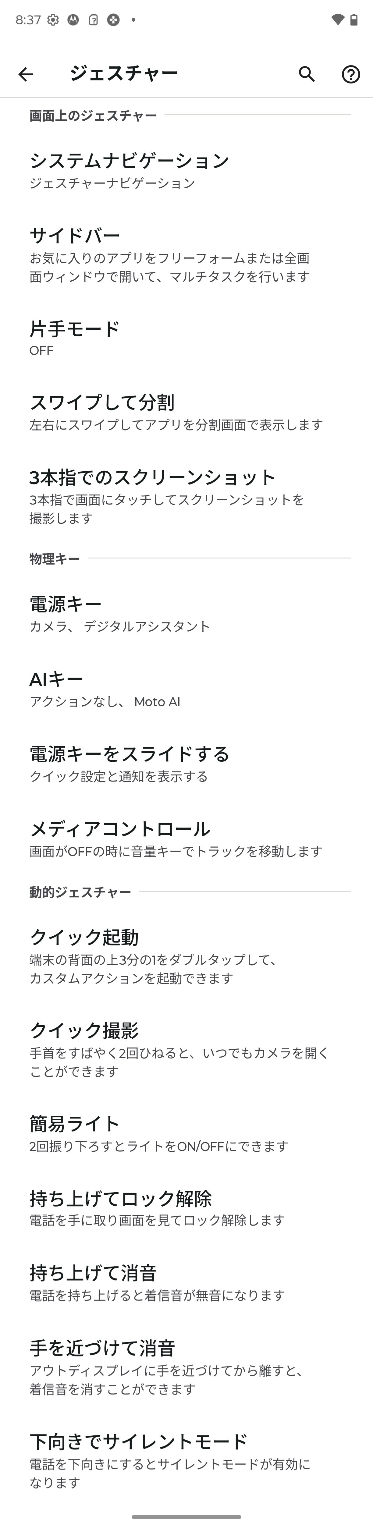 さらに左側面に「AI Key」を搭載しており、電源キーや音量上下キーの長押しや2回押しとともにさまざまなショートカットキー機能が「設定」の「ジェスチャー」でカスタマイズできます。また電池も縦開き型フォルダブルスマホとしては大容量の4700mAhバッテリーを搭載し、外部接続・充電端子はUSB Type-Cで、超急速充電「Turbo Power」(最大68W)とワイヤレス充電(最大30W)、ワイヤレス給電(最大5W)に対応しており、最適化充電や過充電防止などの機能が搭載されています。なお、最適化充電や過充電防止は同時には利用できないようになっていました。