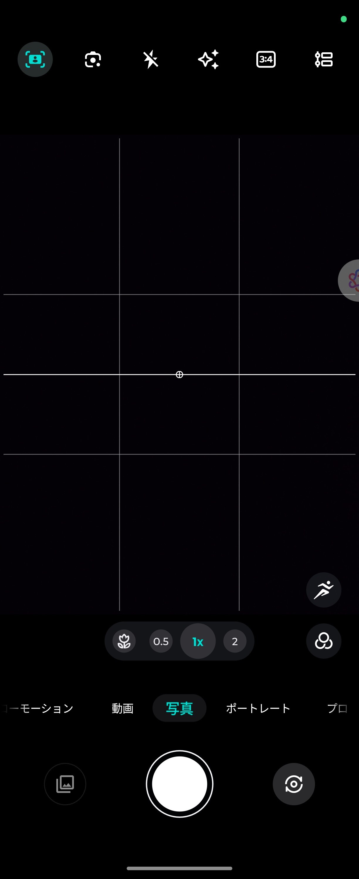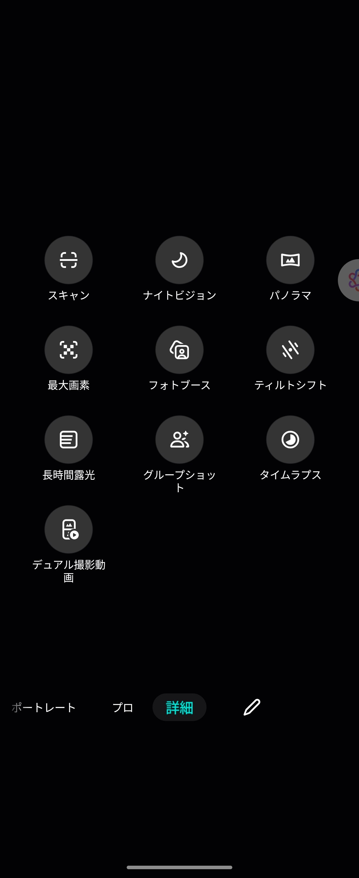 標準カメラアプリのファインダー(撮影)画面(画像=左)とモードの詳細画面。「写真」および「動画」、「スローモーション」、「ポートレート」、「プロ」、「スキャン」、「ナイトビジョン」、「パノラマ」、「最大画素」、「フォトブース」、「ディルトシフト」、「長時間露光」、「グループショット」、「タイムラプス」、「ディアル撮影動画」といった多彩なモードが用意されています。またマクロ撮影にも対応しています