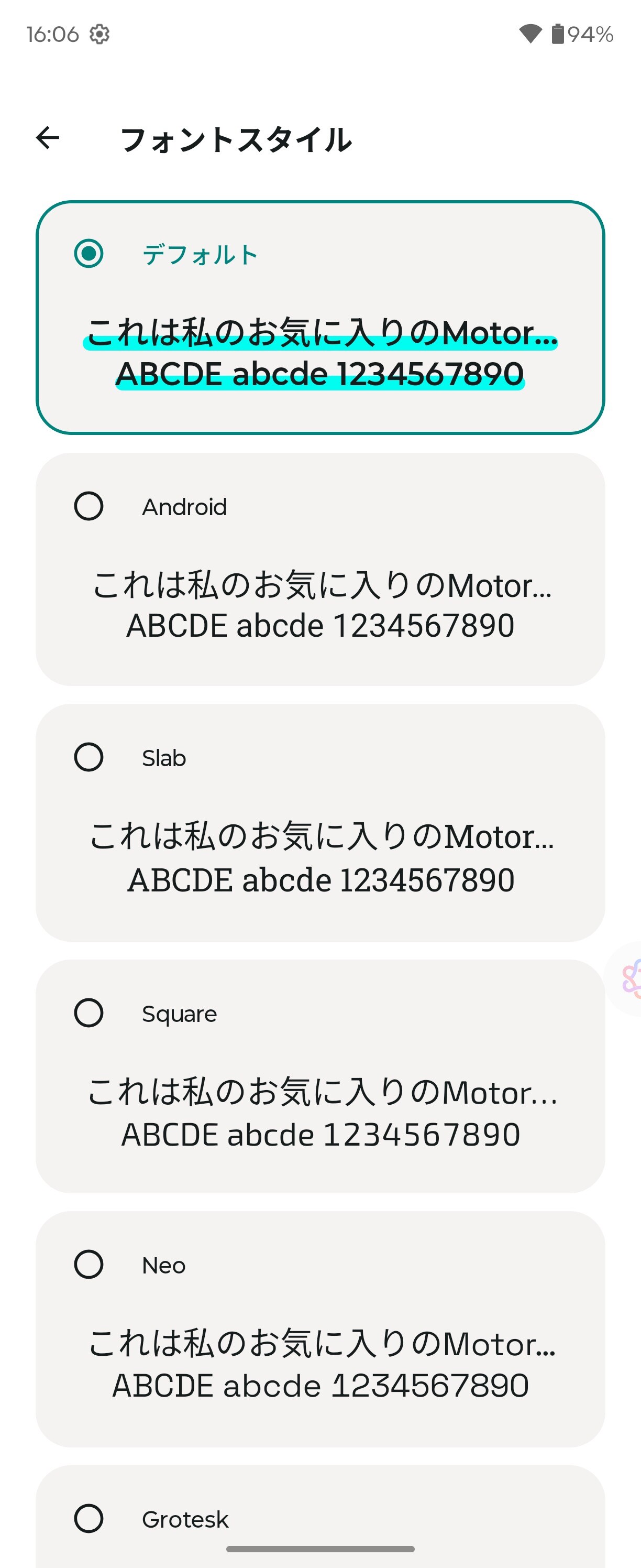 バッテリーの設定画面とフォントスタイルの設定画面。フォントは初期状態(デフォルト)の他に「Android」および「Slab」、「Square」、「Neo」、「Grotesk」がプリインストールされています