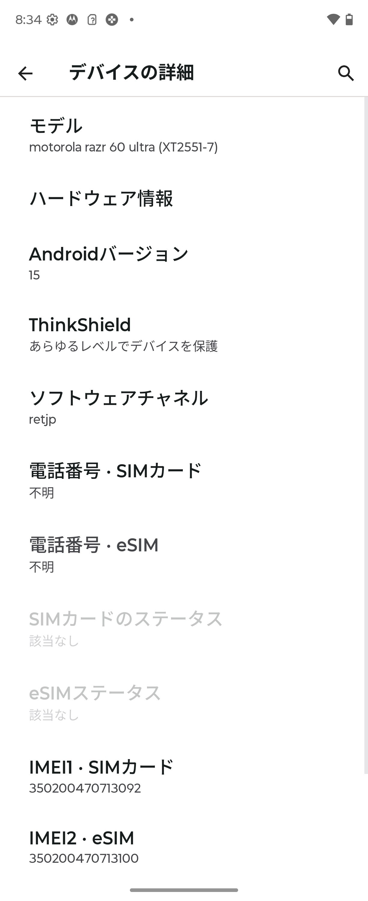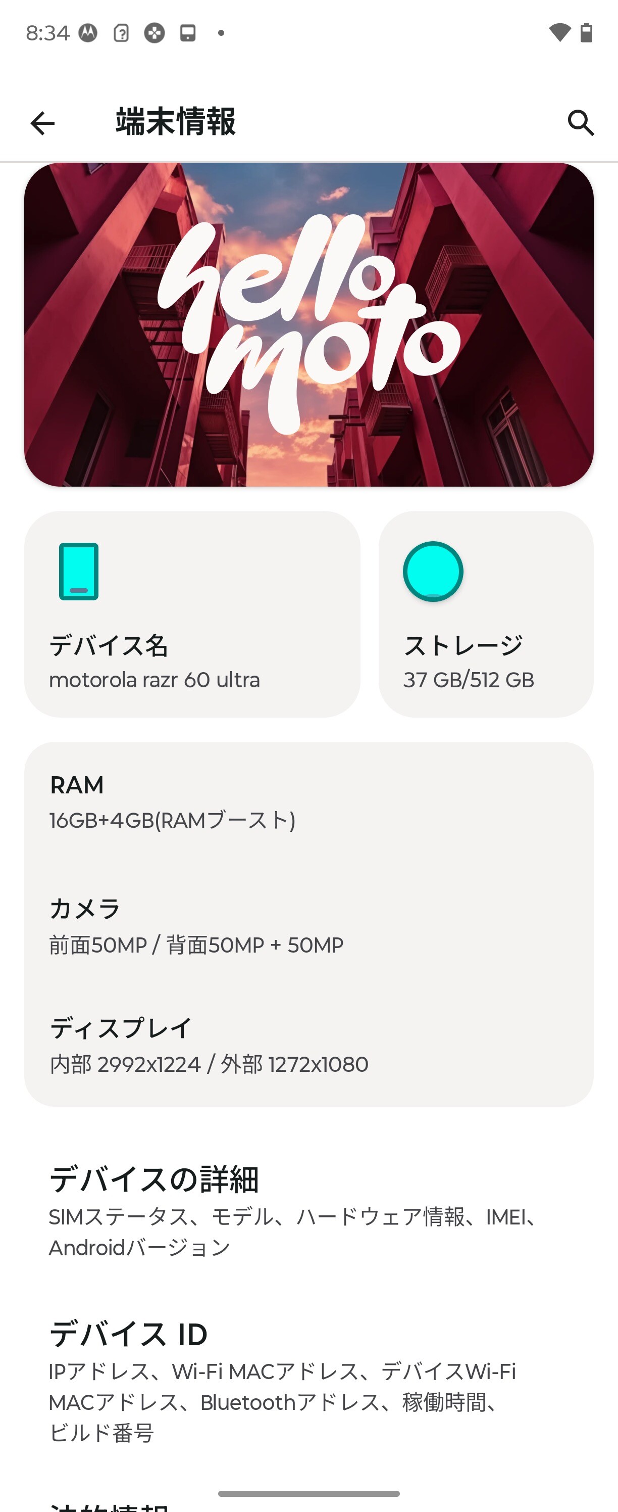 その他の仕様ではQualcomm Snapdragon SoundやDolby Atmos、デュアルステレオスピーカー、マイク×3、赤外線センサー、近接センサー、環境光センサー、加速度センサー、ホールセンサー、ジャイロセンサー、気圧センサー、電子コンパスなどで、3.5mmイヤホンマイク端子や赤外線通信(リモコン機能含む)、ラジオ、ワンセグ、フルセグなどは非対応です。OSはAndroid 15(Hello UX)がプリインストールされており、Android 16へのOSバージョンアップが予定されています。motorola razr 60 ultraはスエード調の背面パネルの質感も良く、性能も高いため、メインディスプレイの折り目はあまり気にならず、縦開き型フォルダブルスマホがスタイルとして良いというのならとてもオススメしたい機種だと思います。