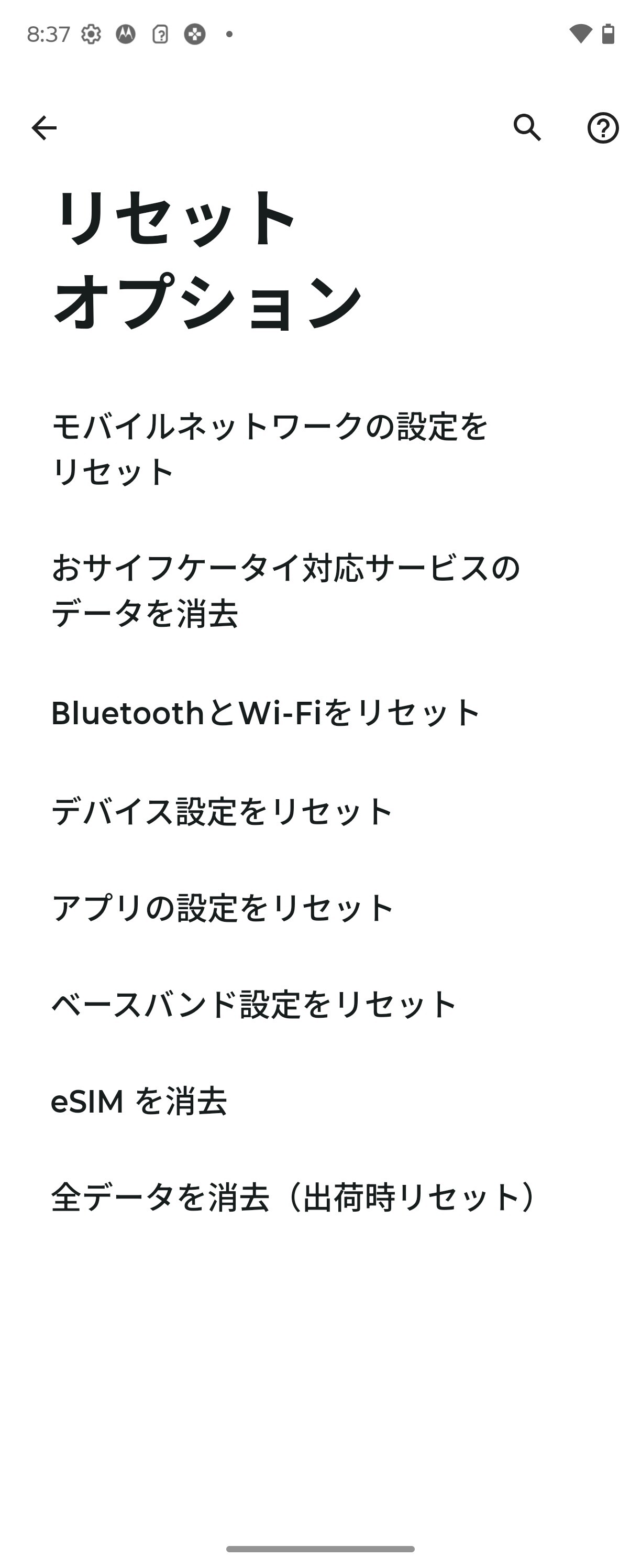 規制情報(画像=左)とリセットオプション(画像=右)。リセットオプションにて「おサイフケータイ対応サービスのデータを消去」に対応しています。またFCC IDは「IHDT56AU1」で、日本で利用するための認証(いわゆる「技適」)の番号は電波法に基づく工事設計認証(R)が「202-JMV037」、電気通信事業法に基づく技術基準適合認定(T)が「HPQ25-0027202」。なお、中国製(Made in China)です