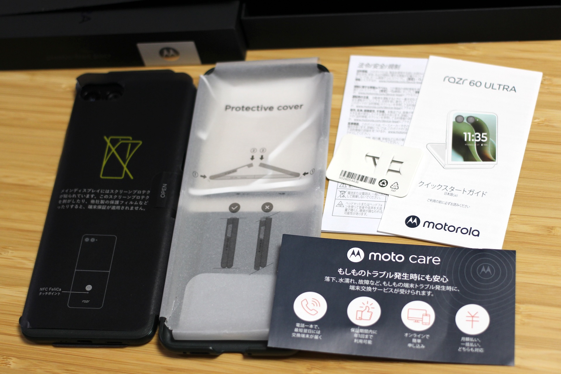 箱(パッケージ)は黒を基調にして上面には「motorola」ロゴや製品名「razr 60 ultra」ロゴが記載され、側面にあるシールを剥がしたり切ったりしてから開けるようになっており、開けるとまずはクイックガイドや保護ケースなどが収納されたスリーブケースが収納されています。その下にmotorola razr 60 ultraの本体があり、付属品はSIMツールおよび保護ケース、保護フィルム、ガイドなどの紙類で、ACアダプターやUSB Type-Cケーブルは同梱されていないのでご注意ください。